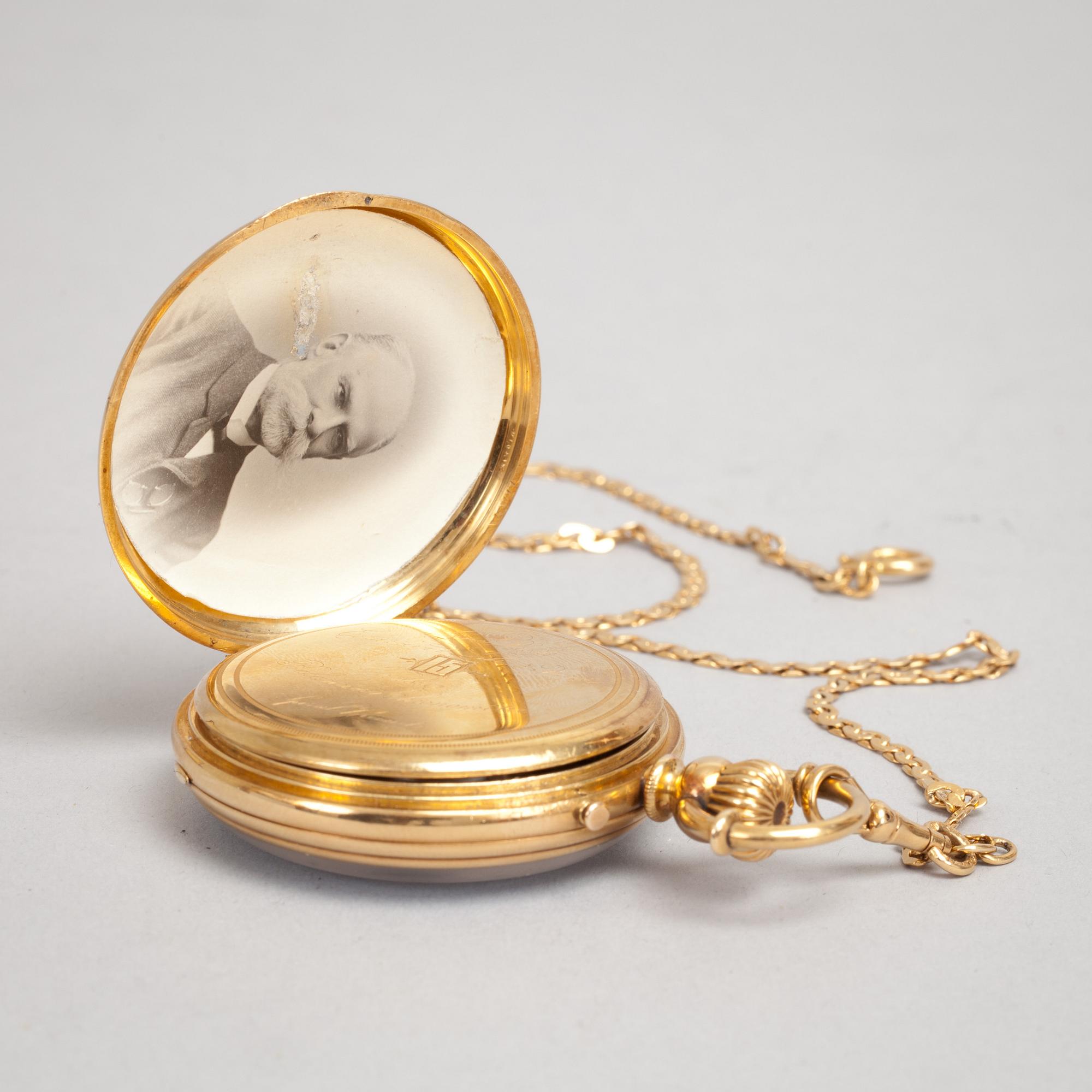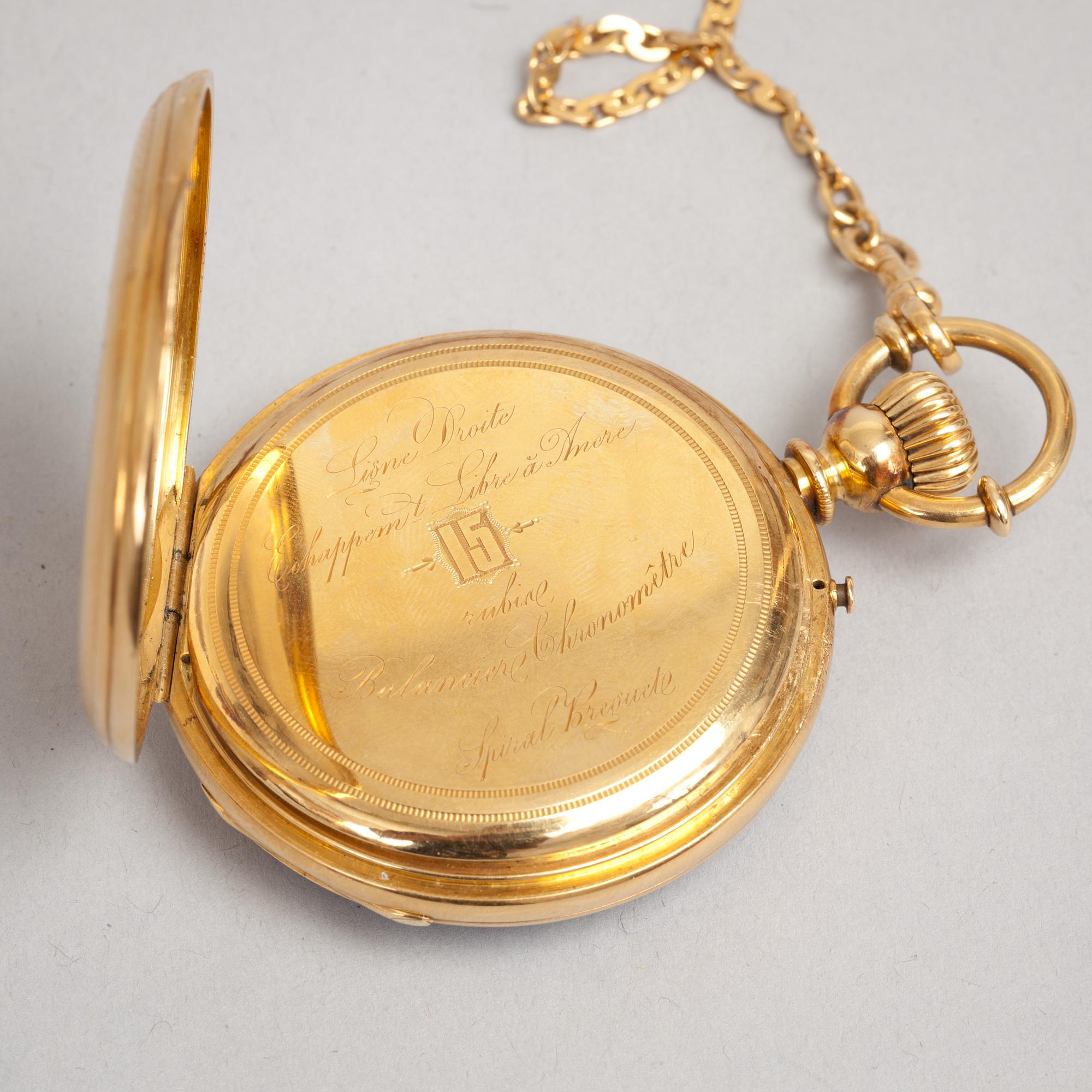Uret stämplad 18k. Märkt "Ligne Droite Echappement Libre a Ancre 15 rubis Balancier Chronomêtre Spiral Breguet". Diam 4,5. Kedja 18k guld, vikt 10 g. l 38,5.