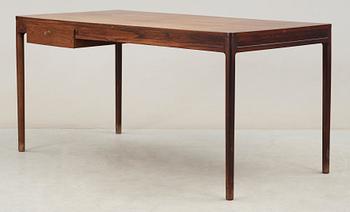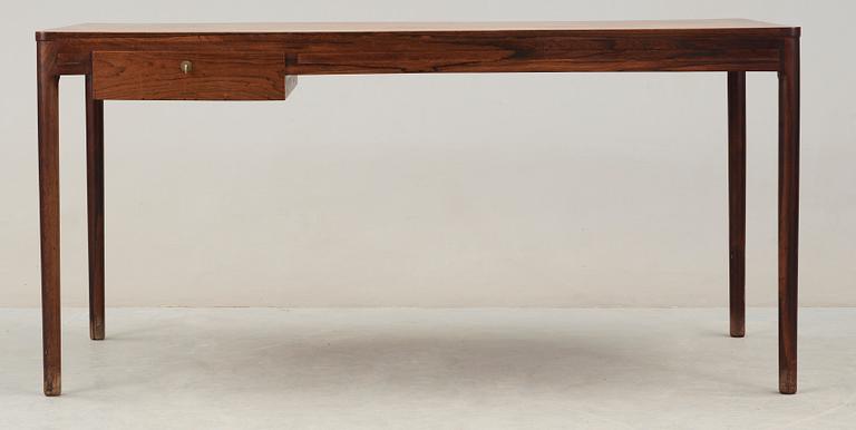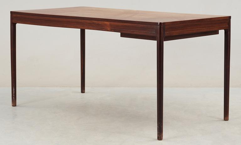 Rak rektangulär form, med utdragslåda. Rundade ben. Längd ca 149,5, djup ca 75, höjd ca 72 cm. Nyckel finns.