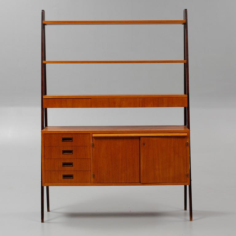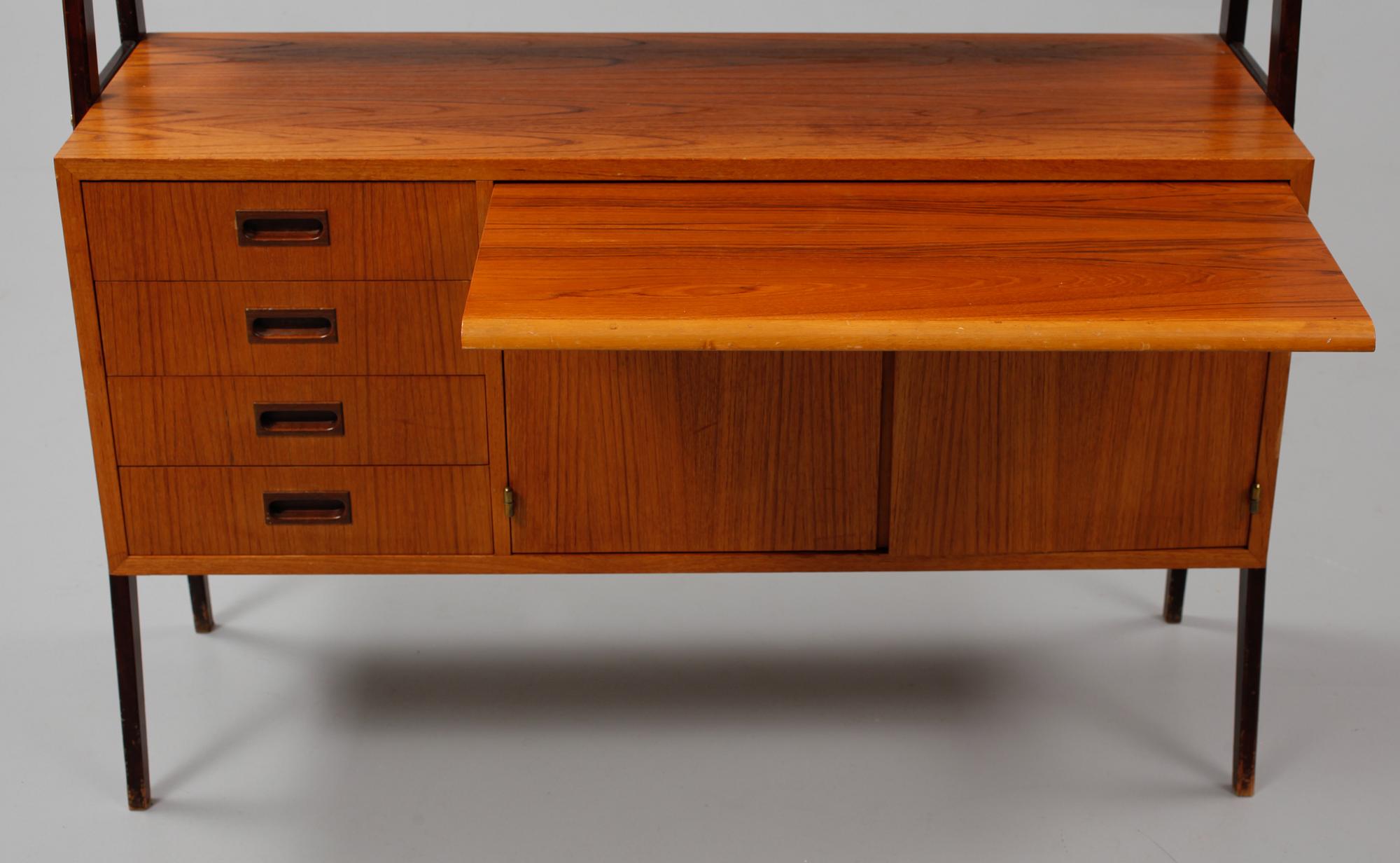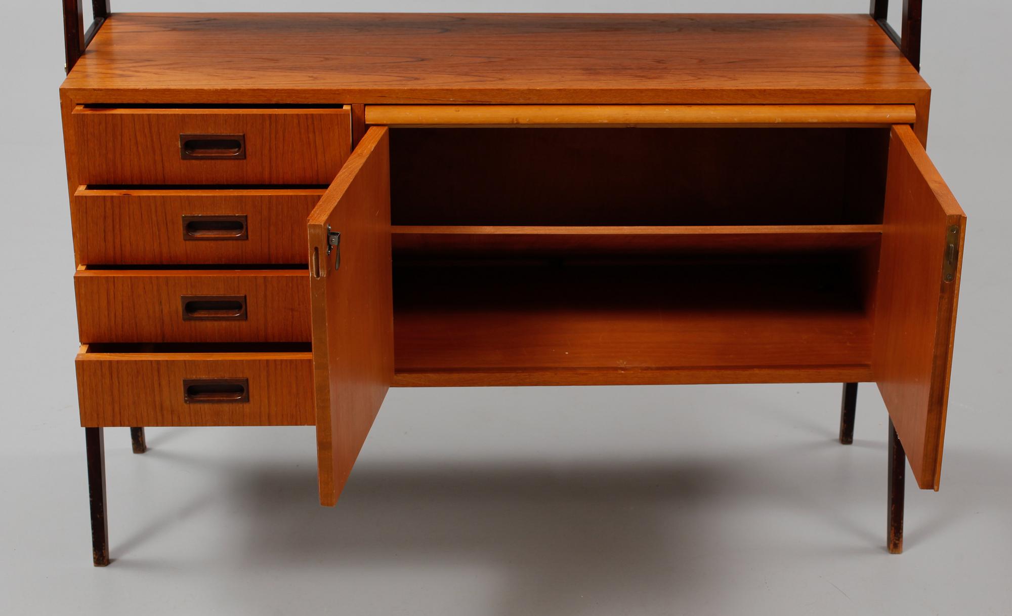 Delvis fanerad i teak, mörkbetsade gavlar. Fyra lådor, ett par skåpsdörrar samt utdragbar skrivskiva. Hylla med tre lådor. Bredd 116, djup 40, höjd 165 cm.