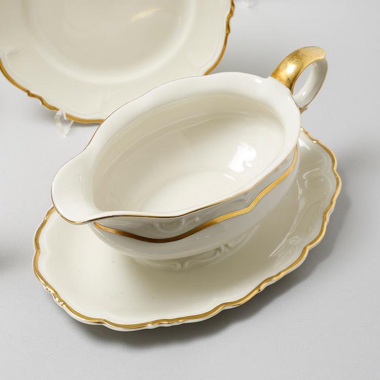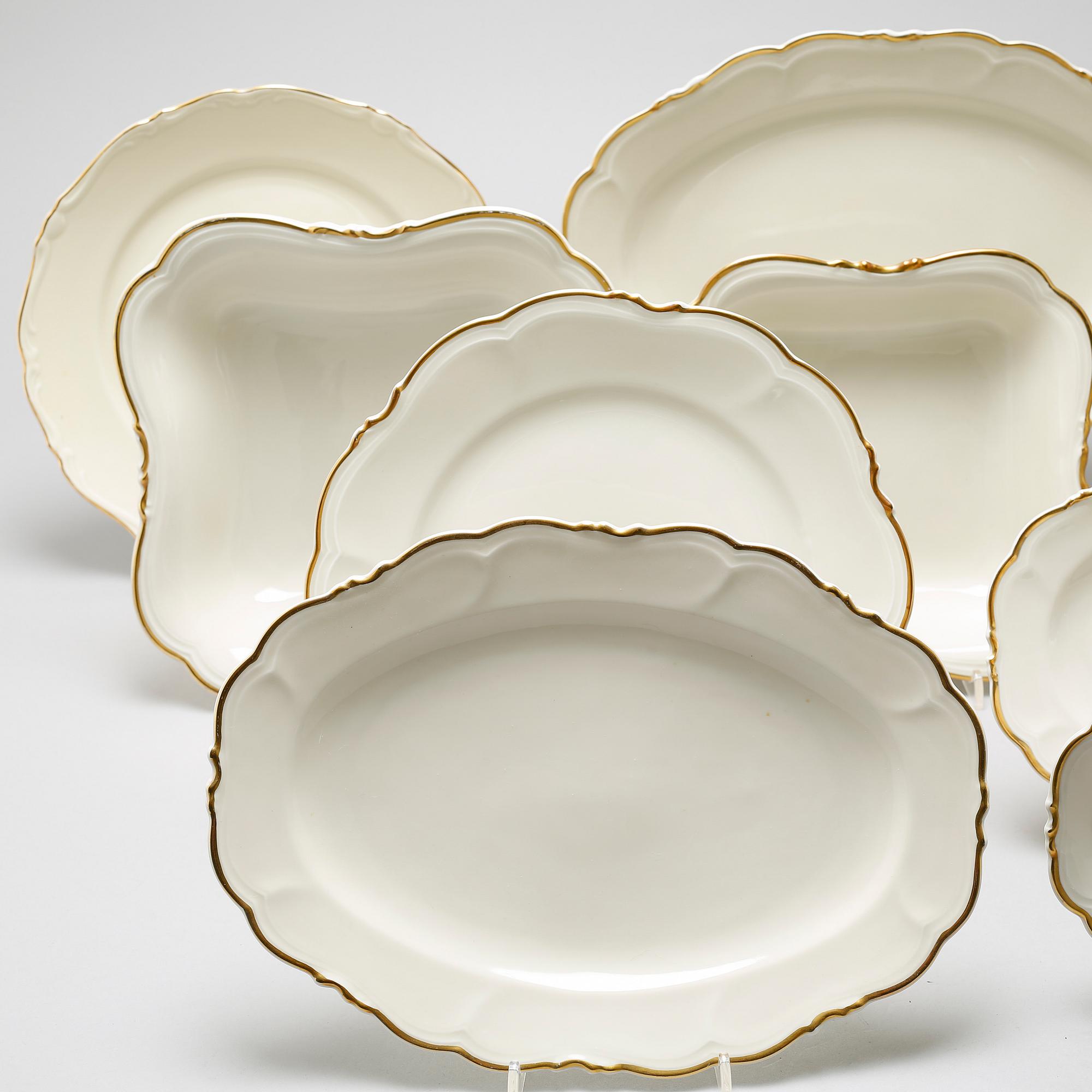 36 dinner plates, 22 soup plates, 12 first course plates, 18 small plates, five serving dishes, four bowls, a gravy boat. The parts are from two similar models.