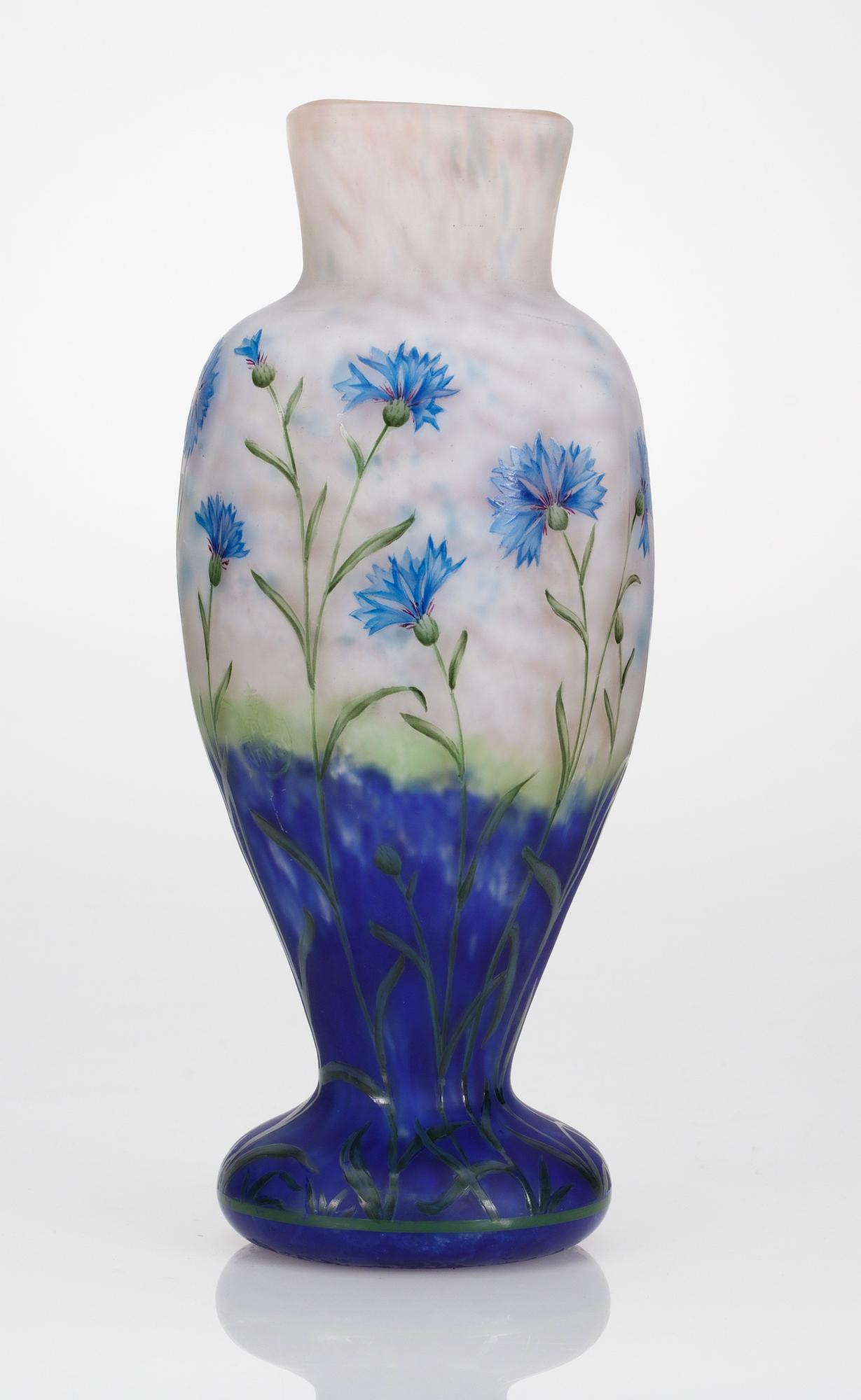 Emaljmålat överfång, dekor av blåklint i blått, rött och grönt mot melerad fond i blått, vitt och rosa. Signerad DAUM NANCY. Höjd 26 cm.