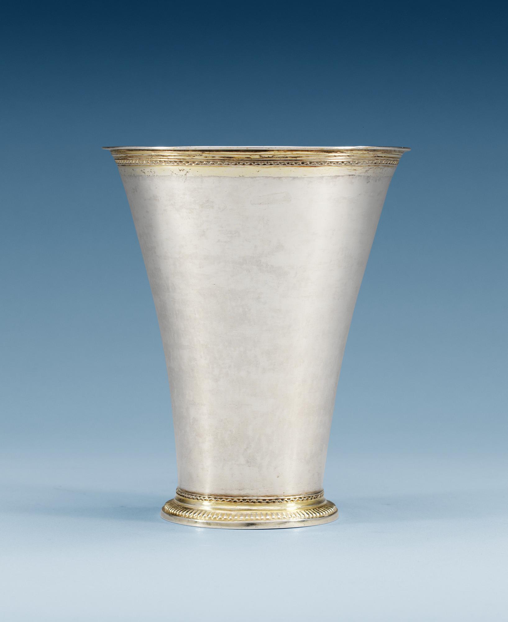Delvis förgylld. Räfflad fotkant, vågband. Höjd 17 cm, vikt 308 g.