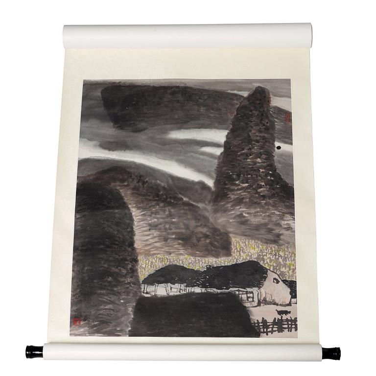 Ink and colour on paper. Calligraphy and two red seals. 79,5 x 64 cm.