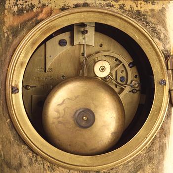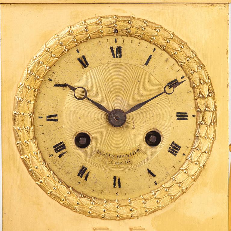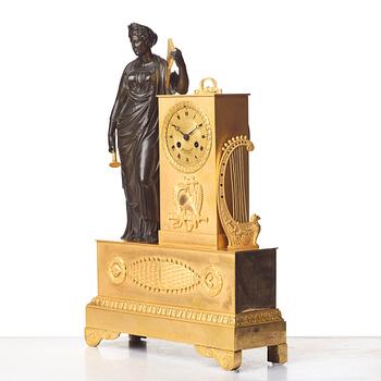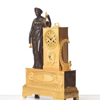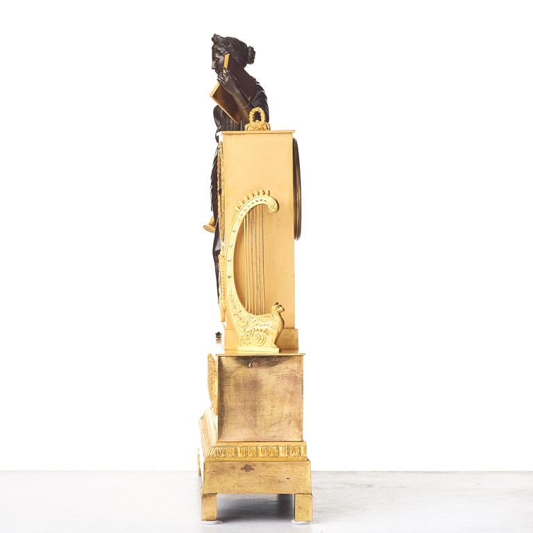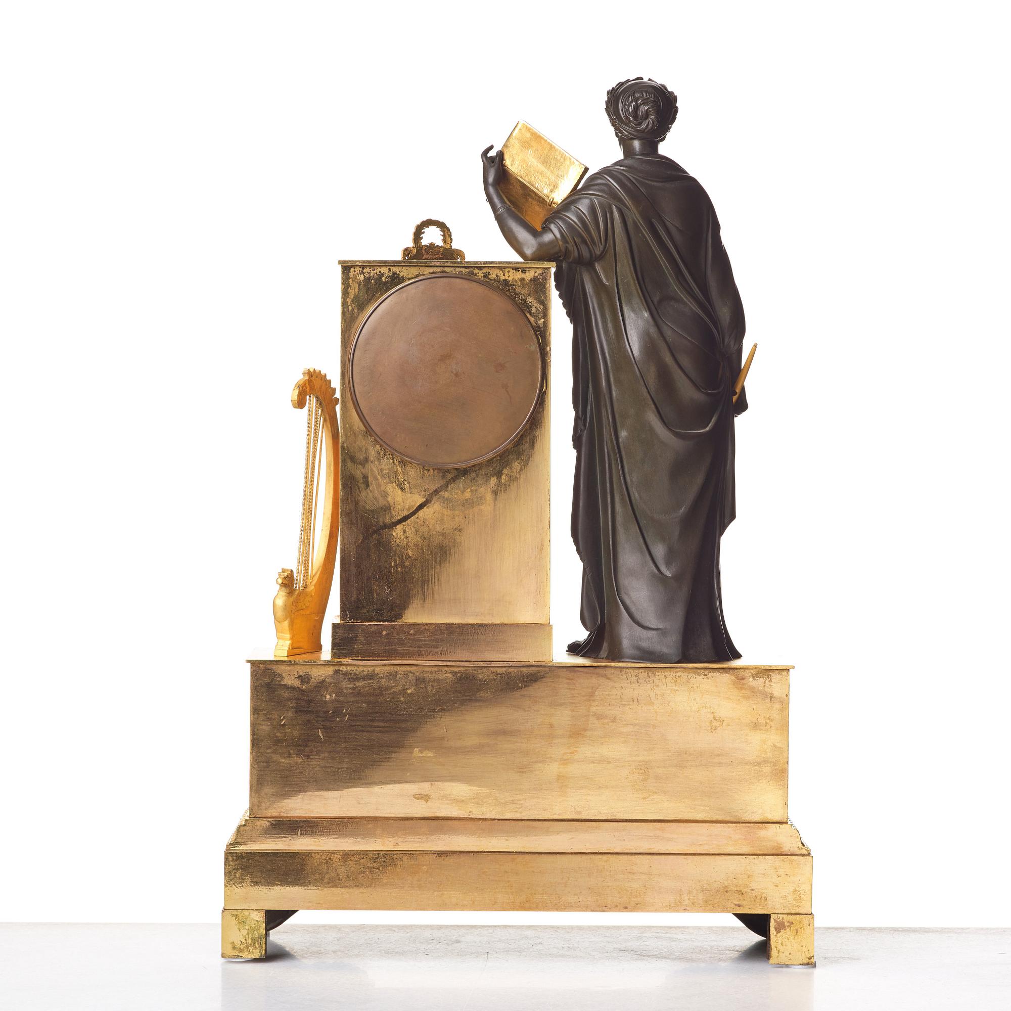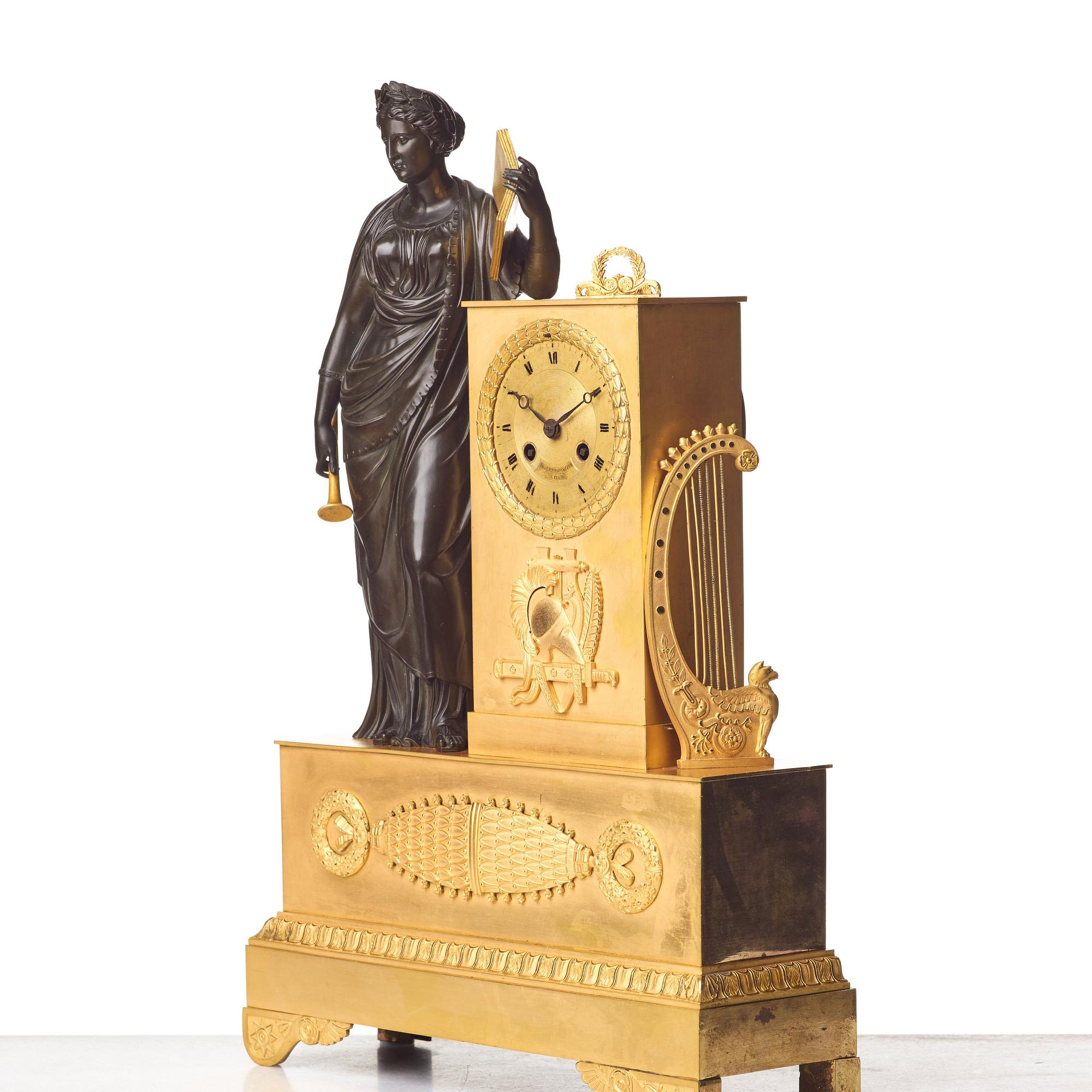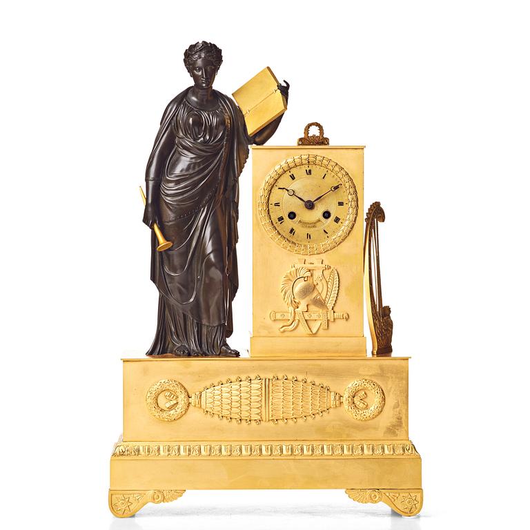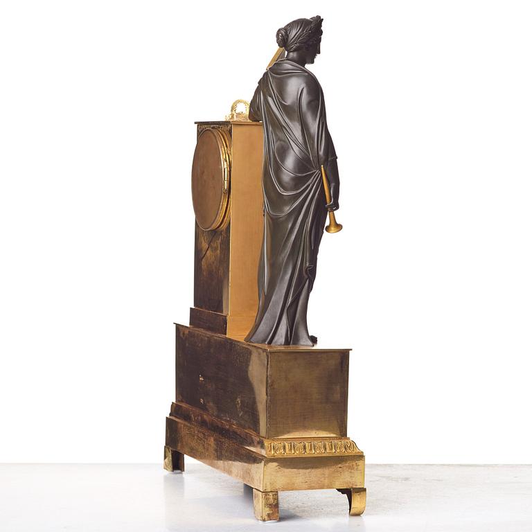 Gilded and patinated bronze. Dial marked "LEDURE BRONZIER REMOND Hr". Standing Cleo with the trumpet of reputation and the book of history writing. Cleo is a Greek woman's name formed from the word kleos which means glory, reputation. Relief of weapon trophy. Length 36, width 12, height 54.5 cm. Pendulum included.