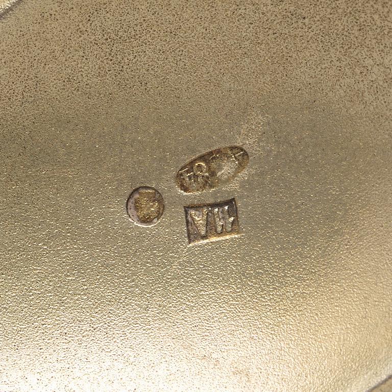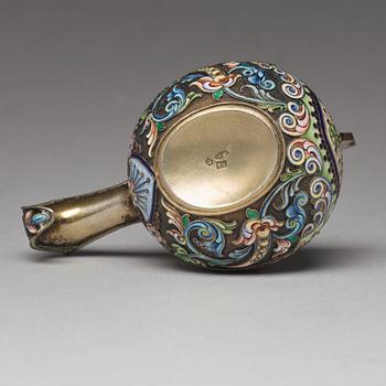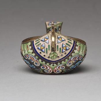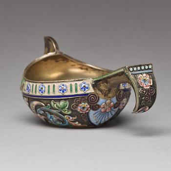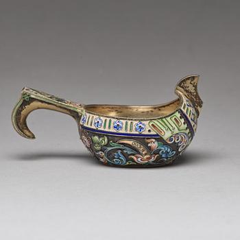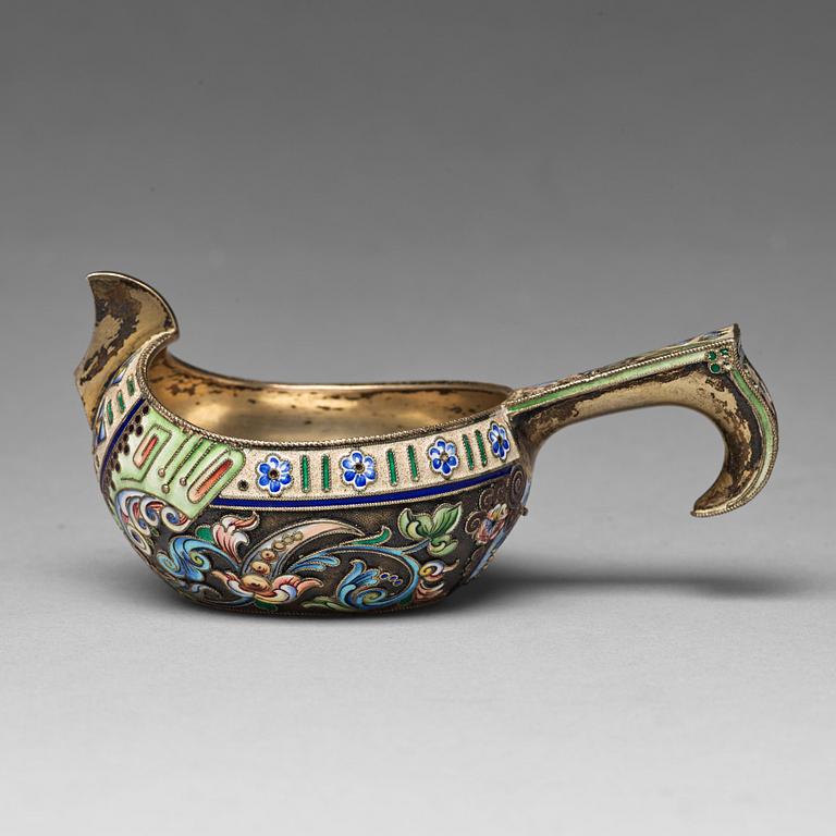 A Russian 20th century silver-gilt and enamled kovsh, mark of the 11th Artel, Moscow 1908-1917.