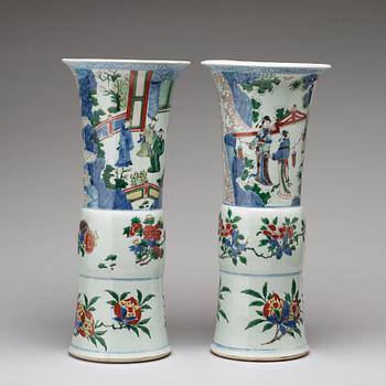 A matched pair of Gu-shaped wucai vases, Transition, 17th Century.