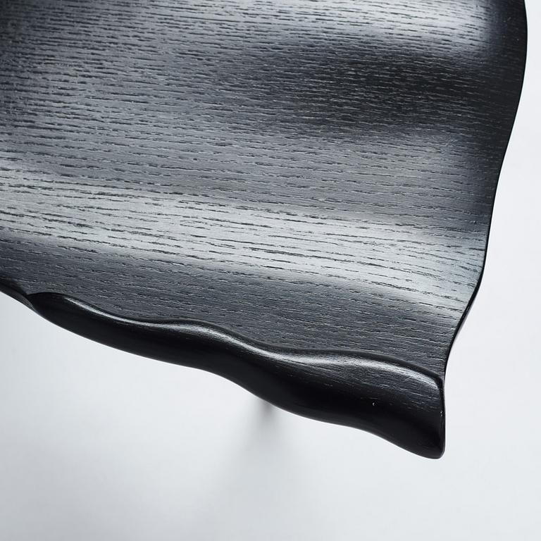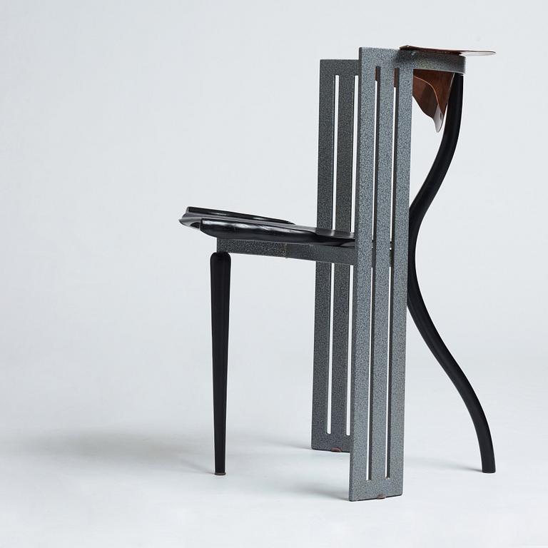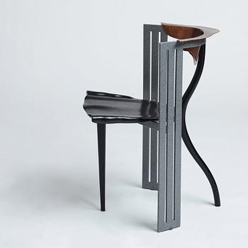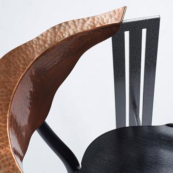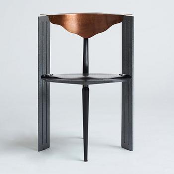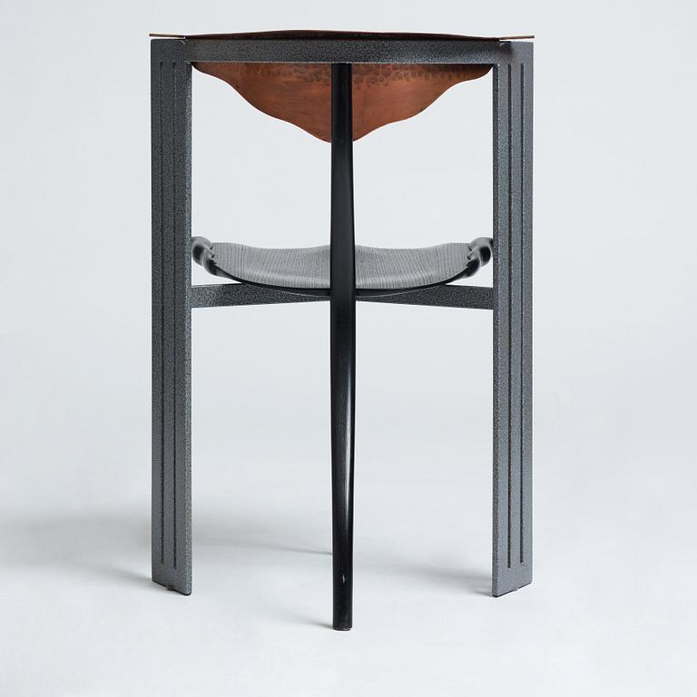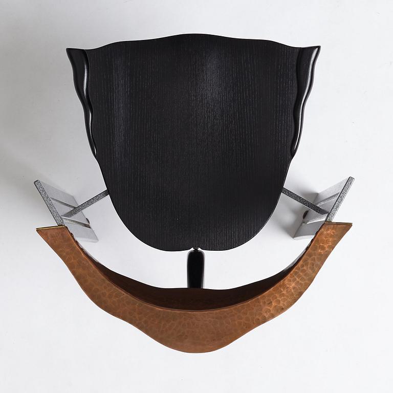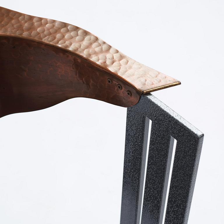 Enamelled steel, the back rest in copper, seat and legs in blackened wood, label marked, height 76 cm.
