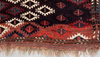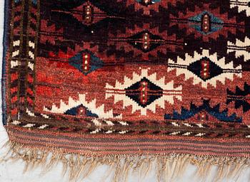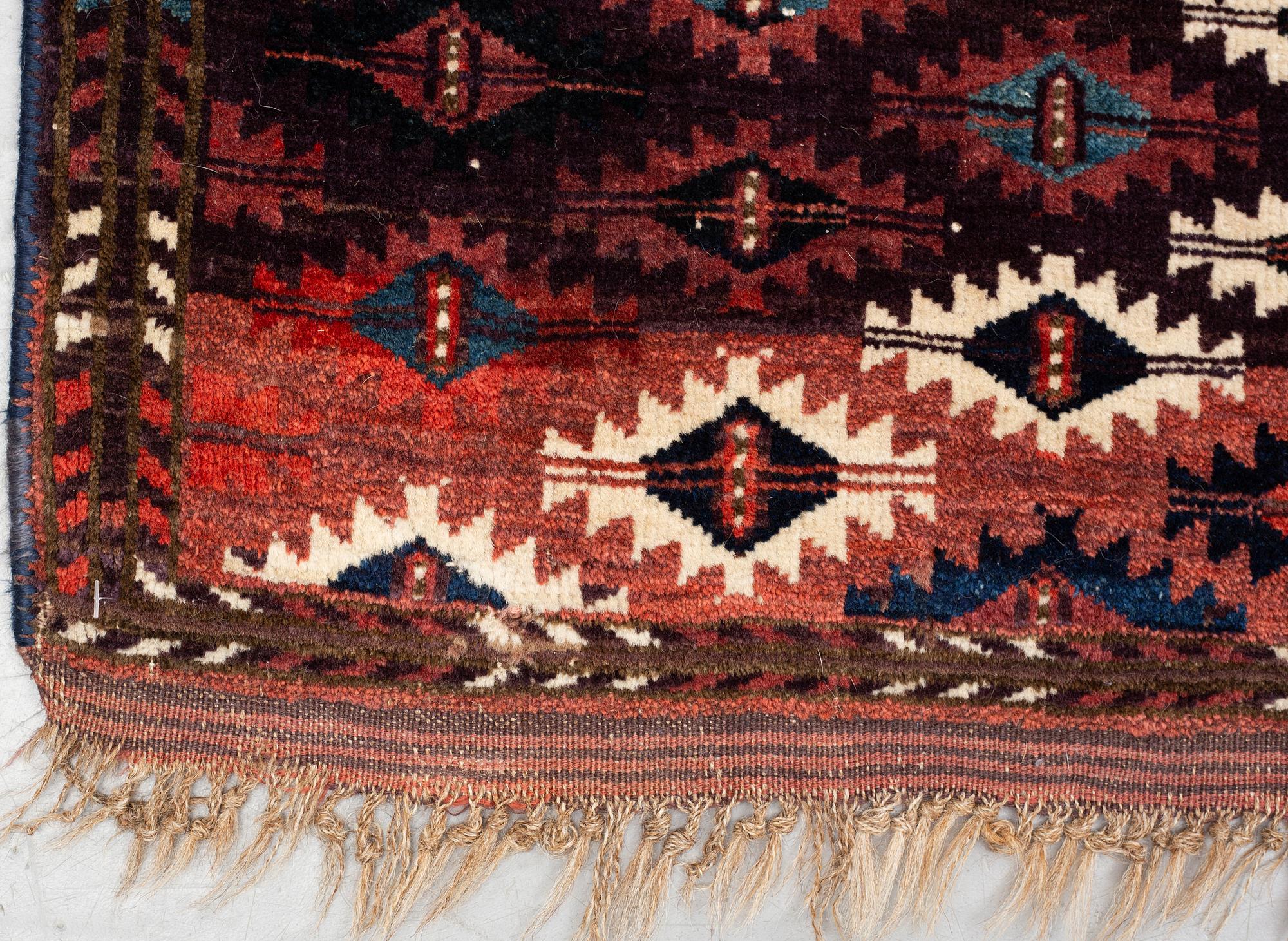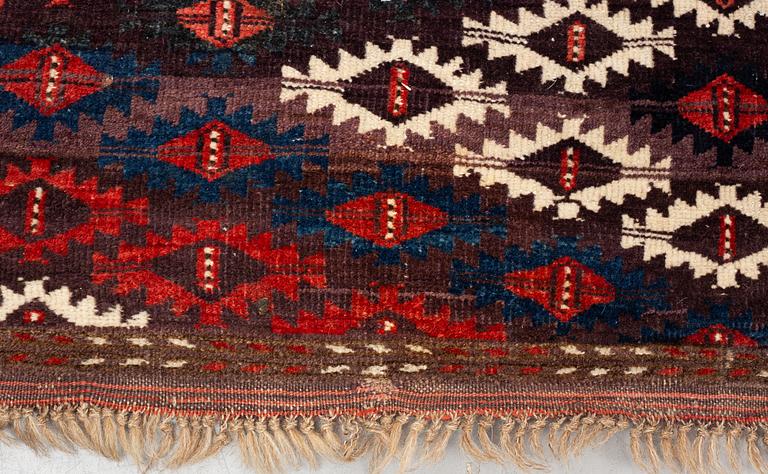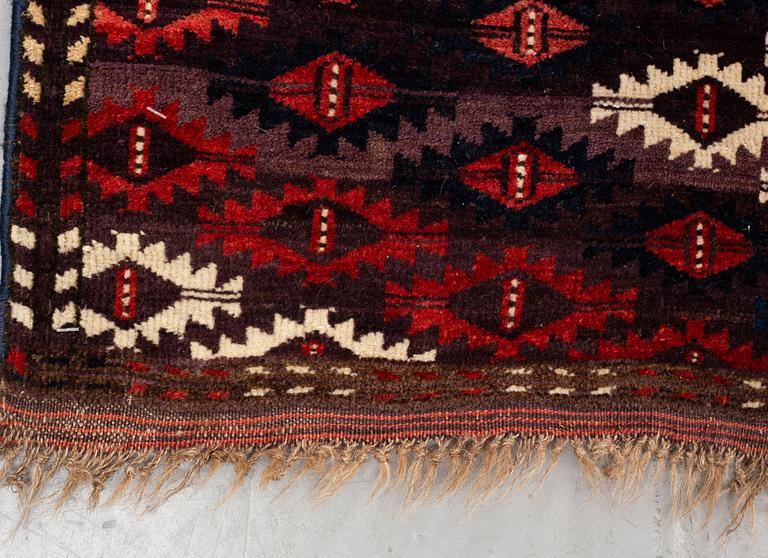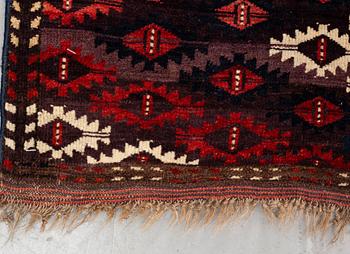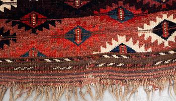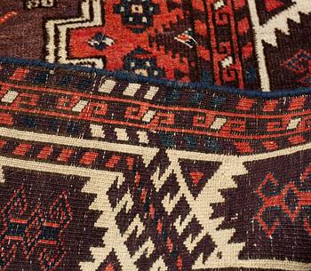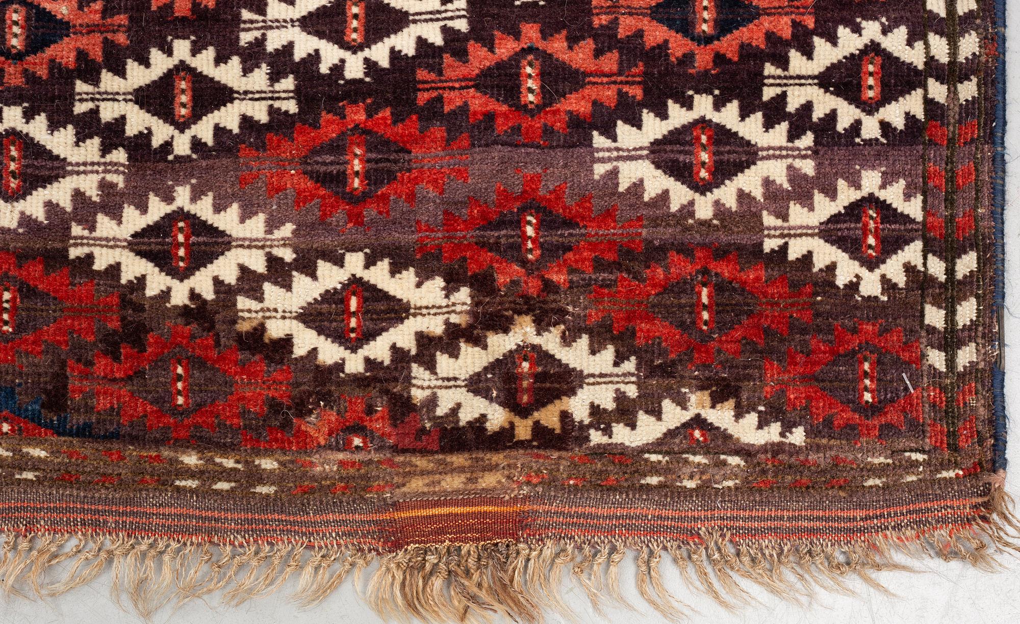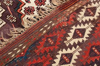 Partly slightly faded, abrashes. Some partly harder wear, slightly dirty, stains, repairs, minor damages. The flat weave at the ends is damaged.