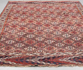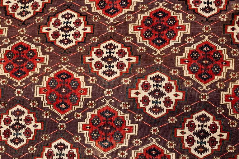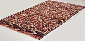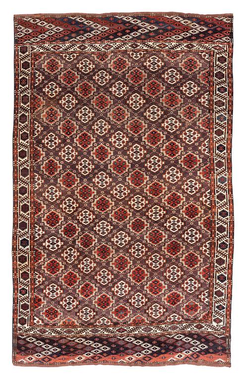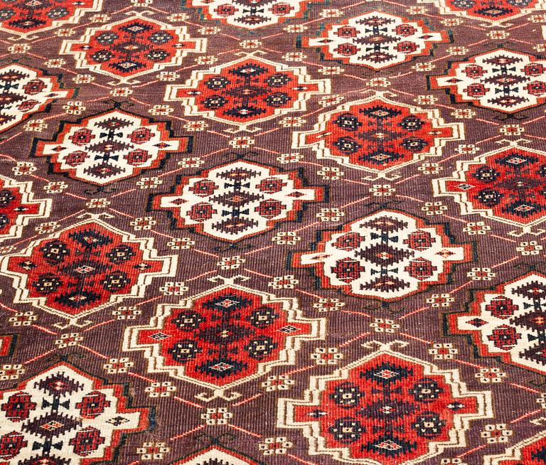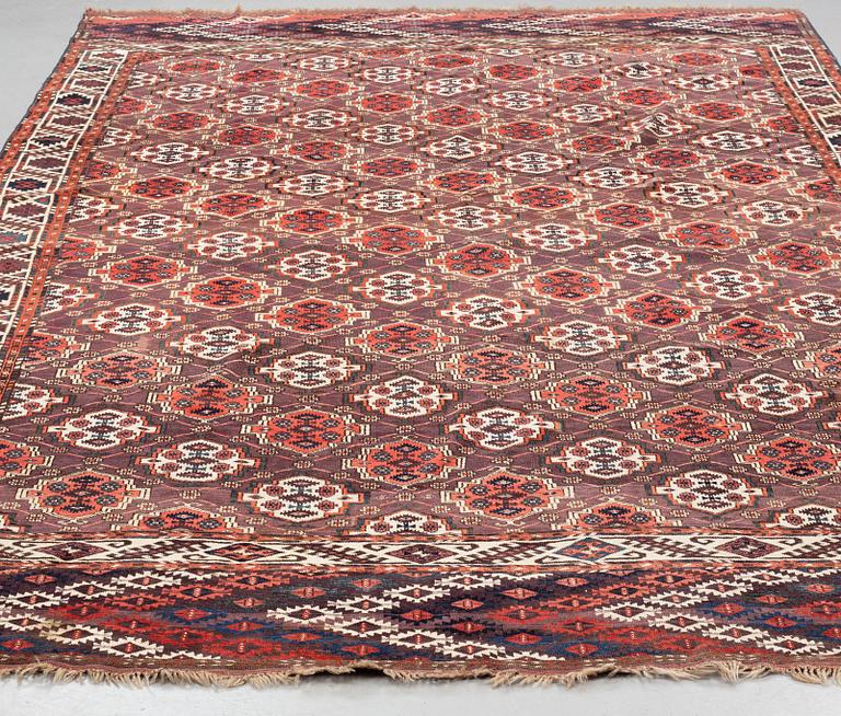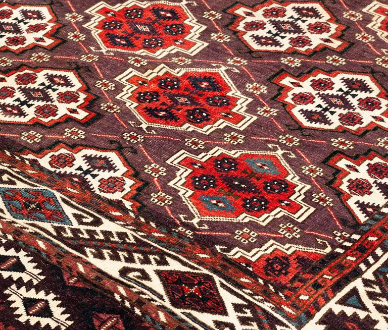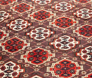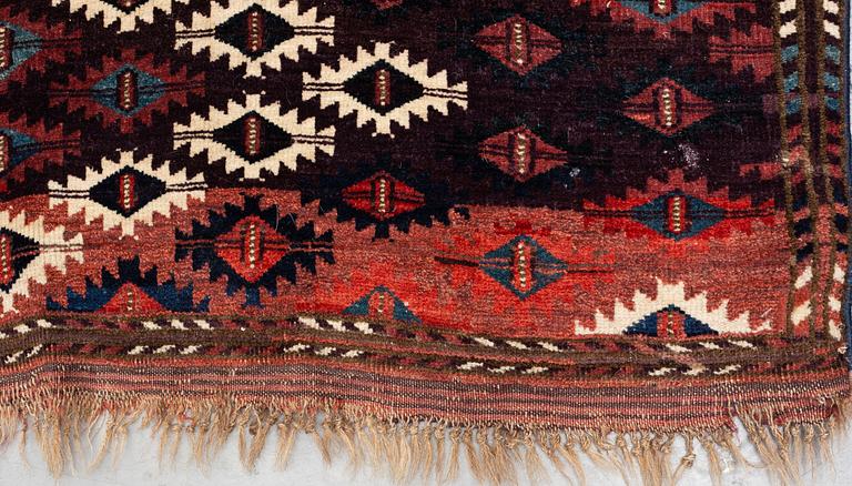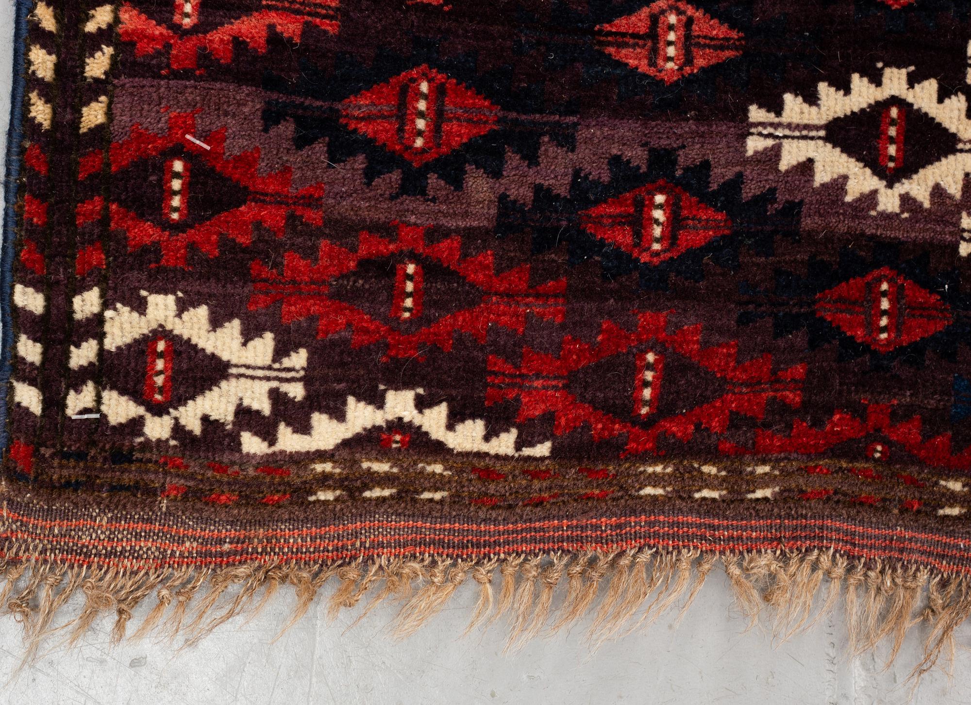 Partly slightly faded, abrashes. Some partly harder wear, slightly dirty, stains, repairs, minor damages. The flat weave at the ends is damaged.