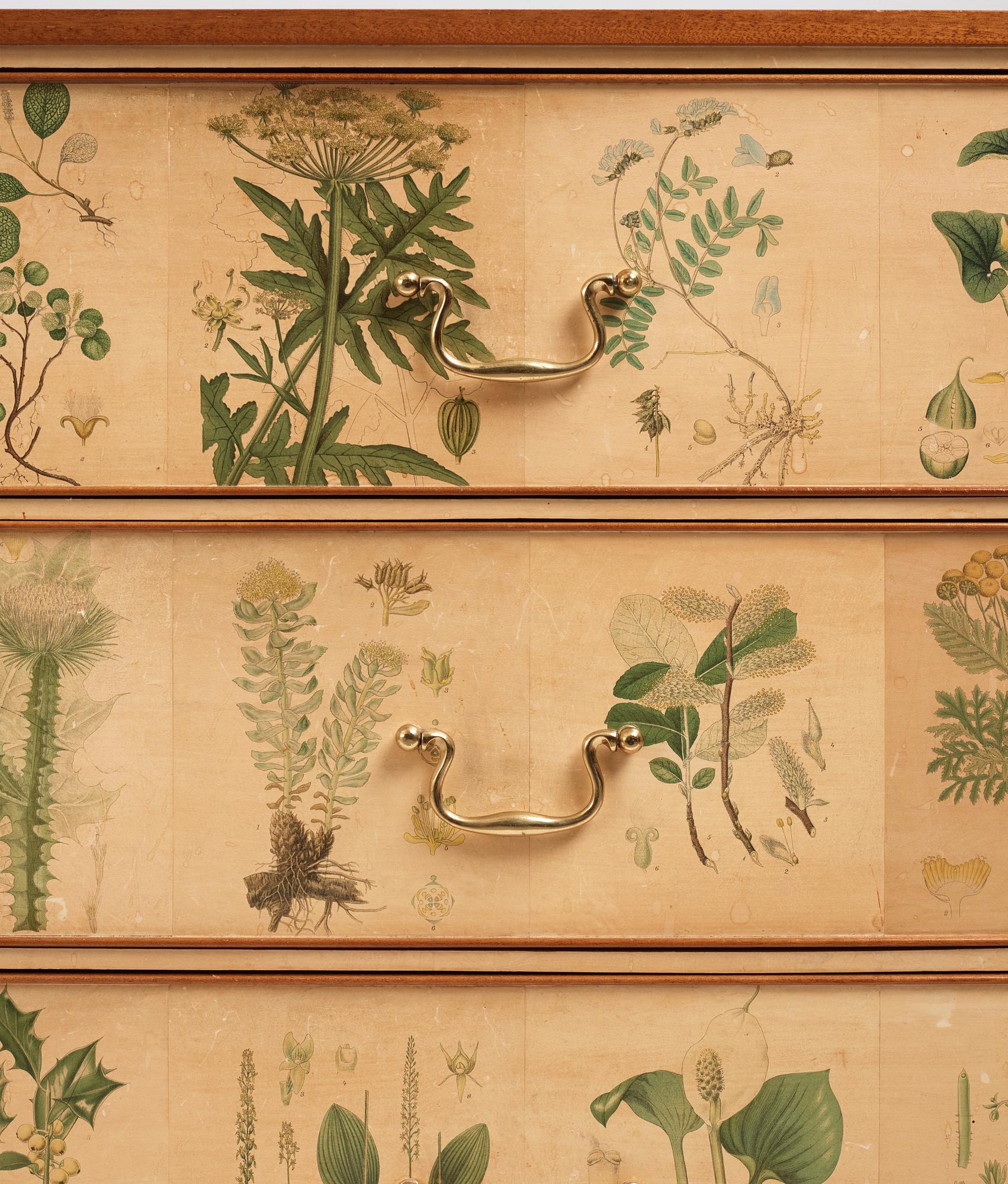 Model "1050", mahogany, floral prints from 'Nordens Flora' after C. A. Lindman, three drawers with brass mounts, ball feet. Width 132 cm, depth 43,5 cm, height 76 cm.
