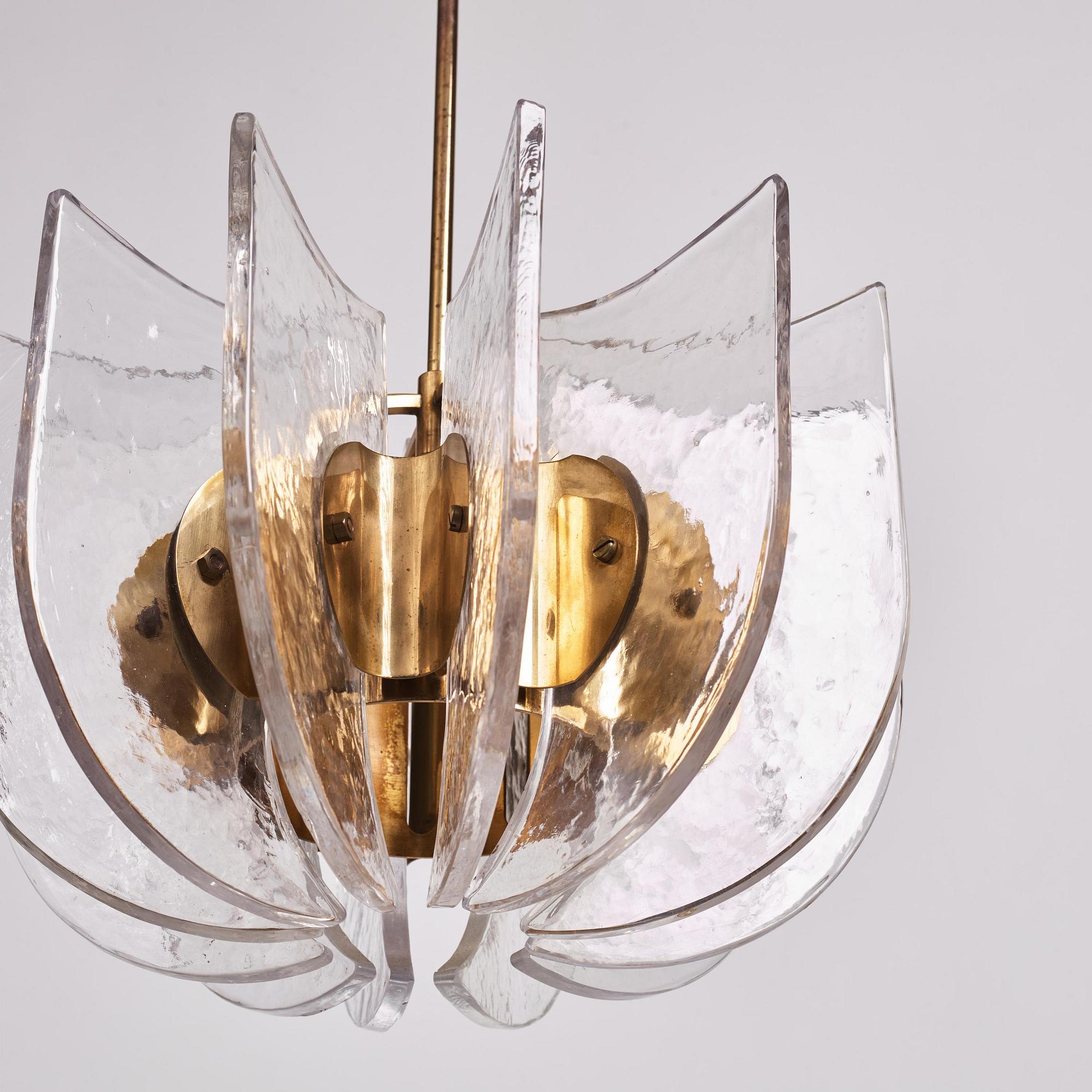 Frame in brass, 12 moulded glass plates, one light point. Total height 95 cm, diameter 40 cm, height of the glass plates 27 cm.