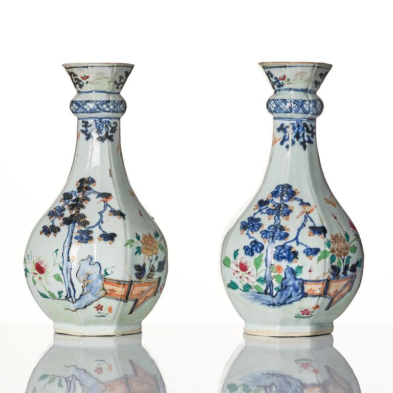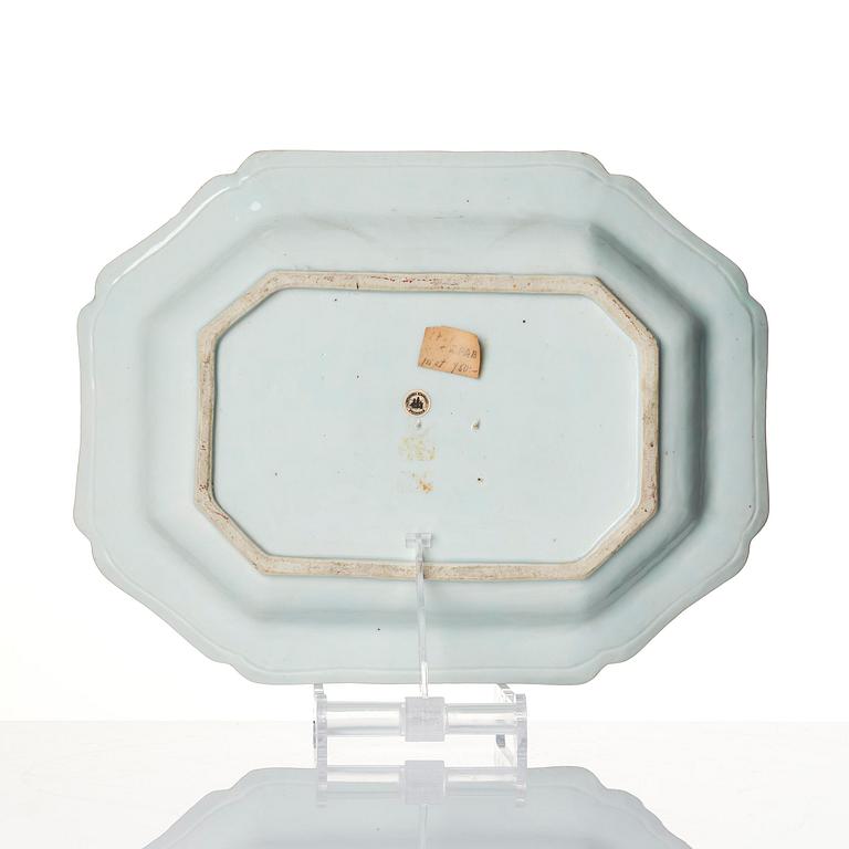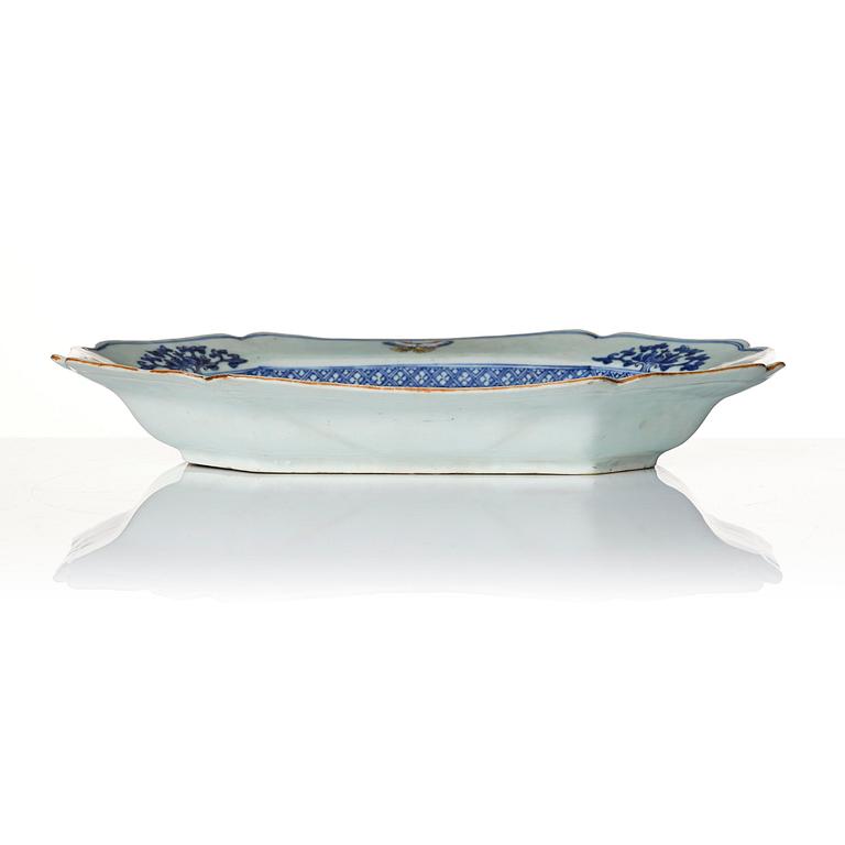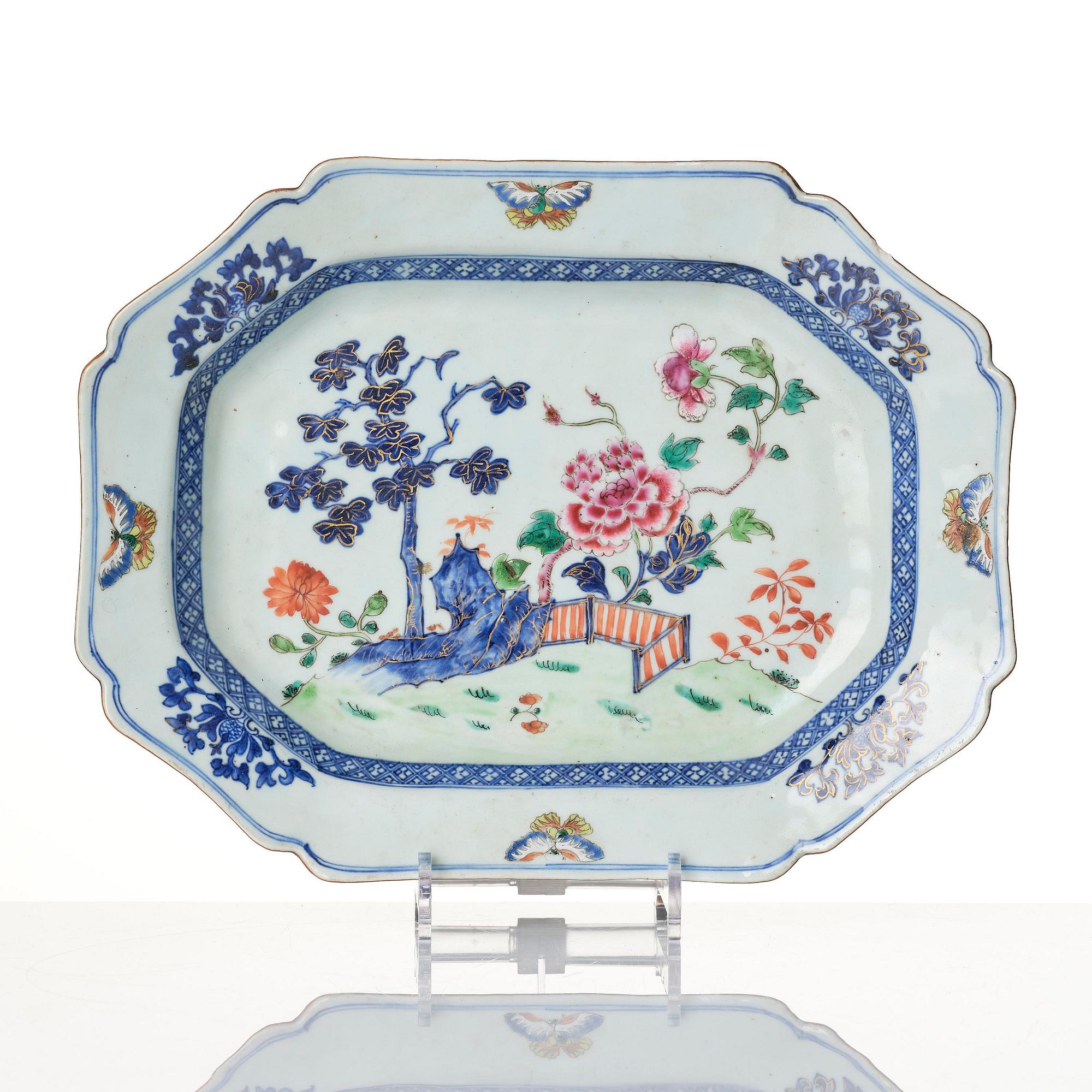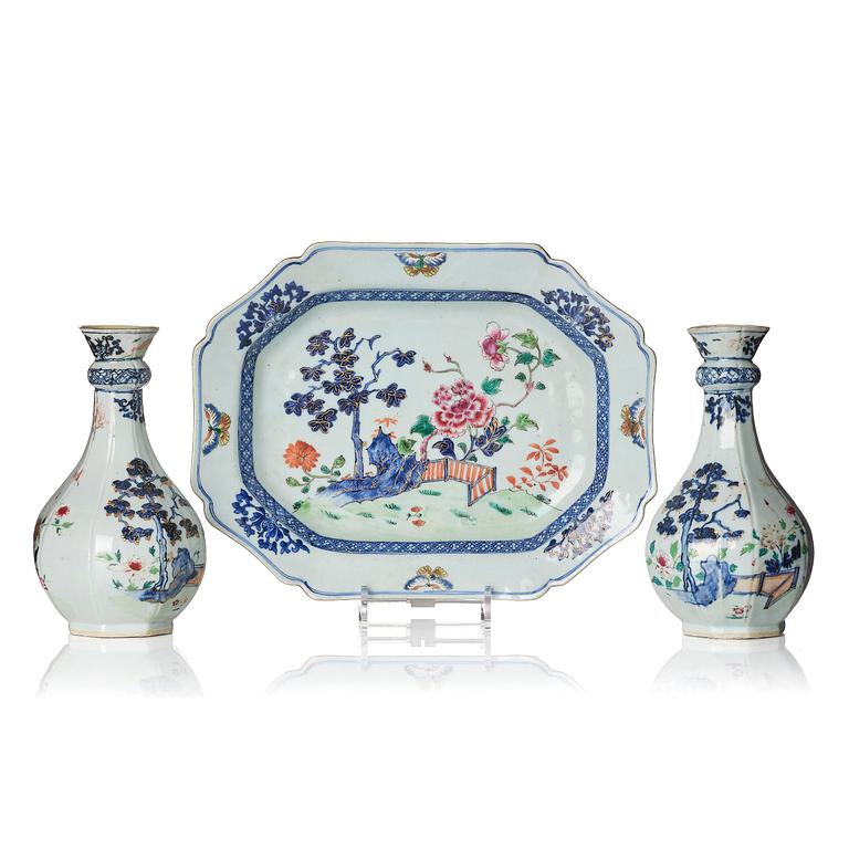 Balustershaped vases decorated in underglaze blue and famille rose. Height 25 cm. The dish after a European silver model, decorated in the same pattern. Lenght 37 cm.