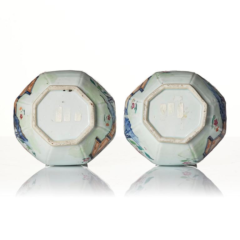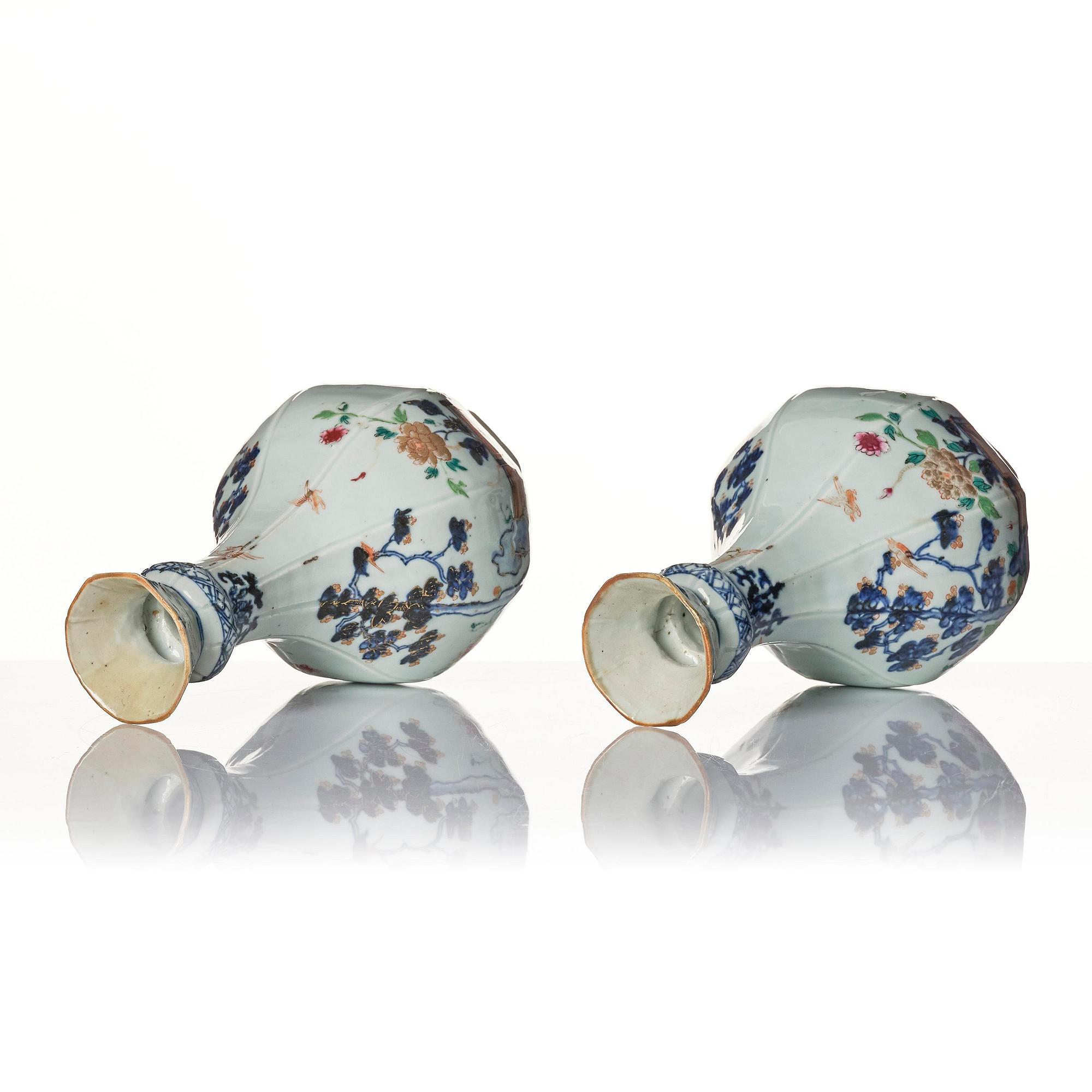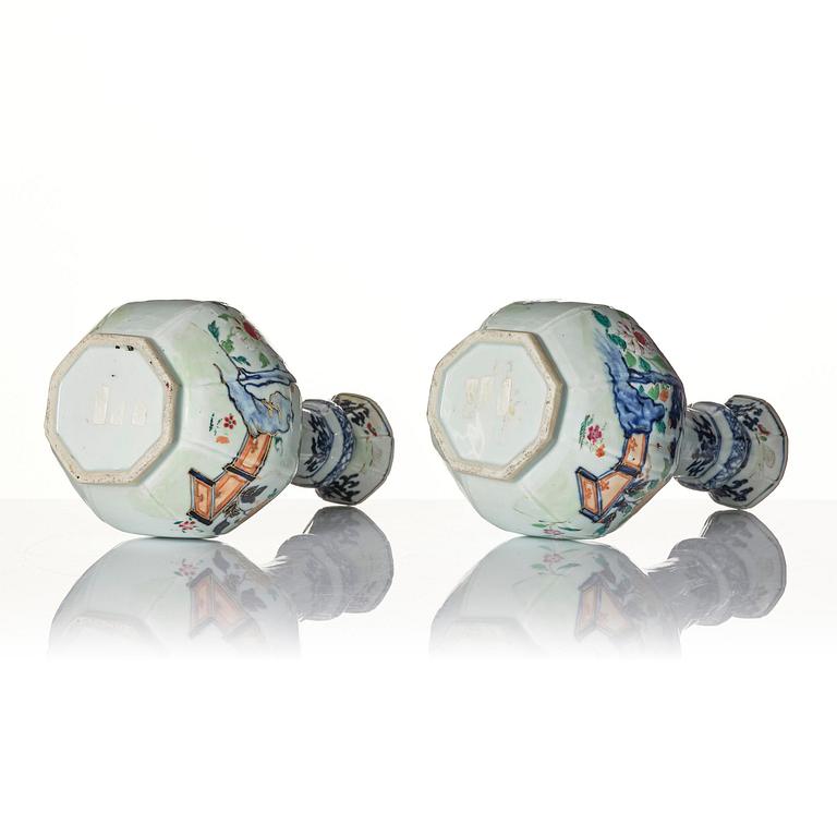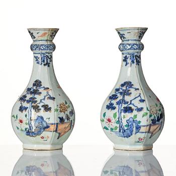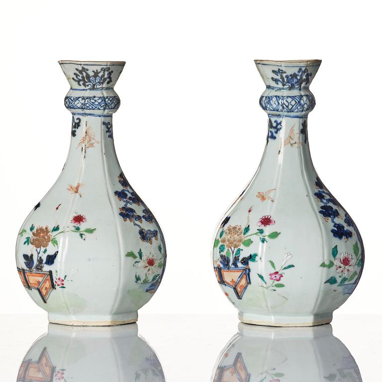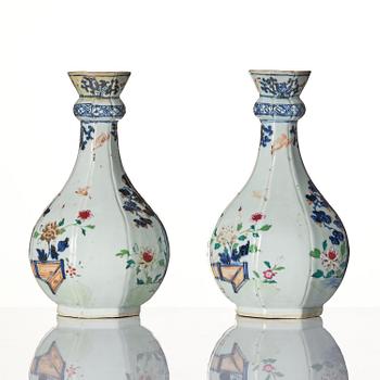 Balustershaped vases decorated in underglaze blue and famille rose. Height 25 cm. The dish after a European silver model, decorated in the same pattern. Lenght 37 cm.