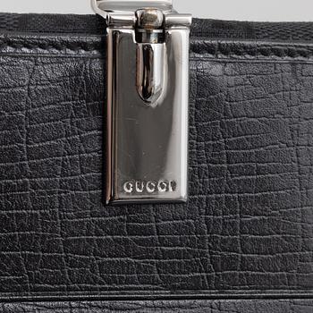 GG monogram canvas in black. Details in black leather. Buckle with bamboo detail. Multiple inner pockets. Marked "GUCCI made in Italy". 11 x 9 cm. In original box.