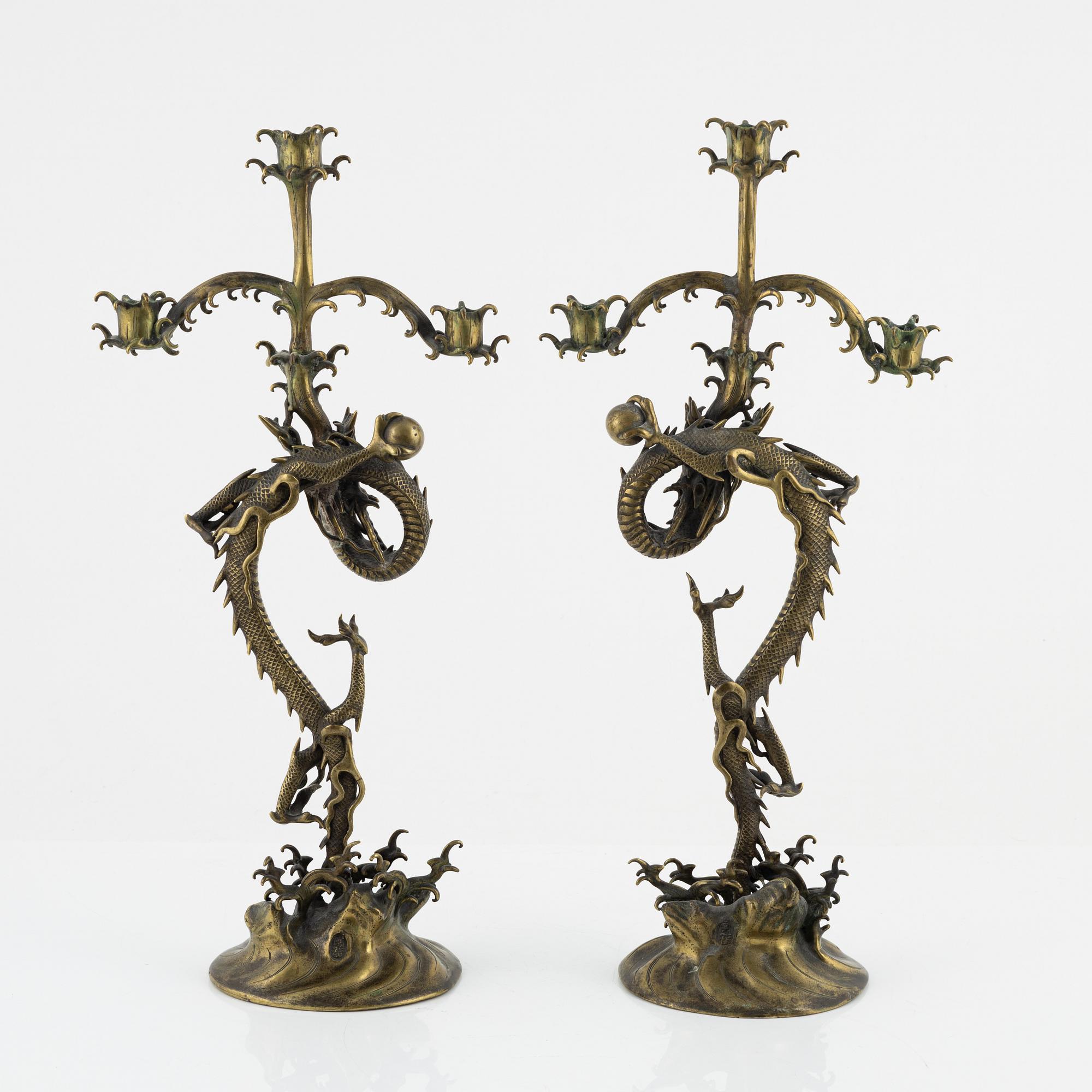 For three candles each, in the shape of dragon. With stamped seals. Height 43, width 21 cm.