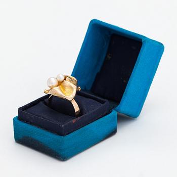 Björn Weckström, Sormus "Särkynyt lehti", 14K kultaa ja viljellyt helmet. Lapponia 1968.