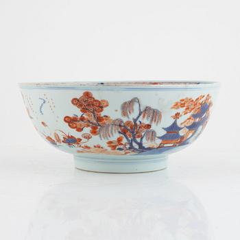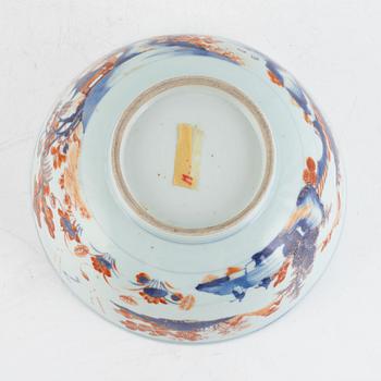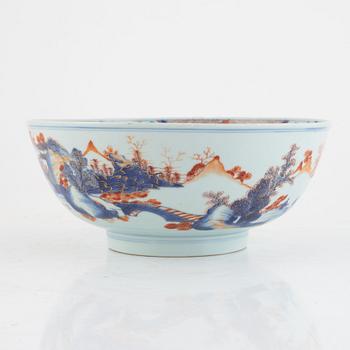 Decorated with two scholars in a landscape with lotus, pines, willows, and pagodas. The interior decorated with peonies. Height 11 cm, diameter 27 cm.