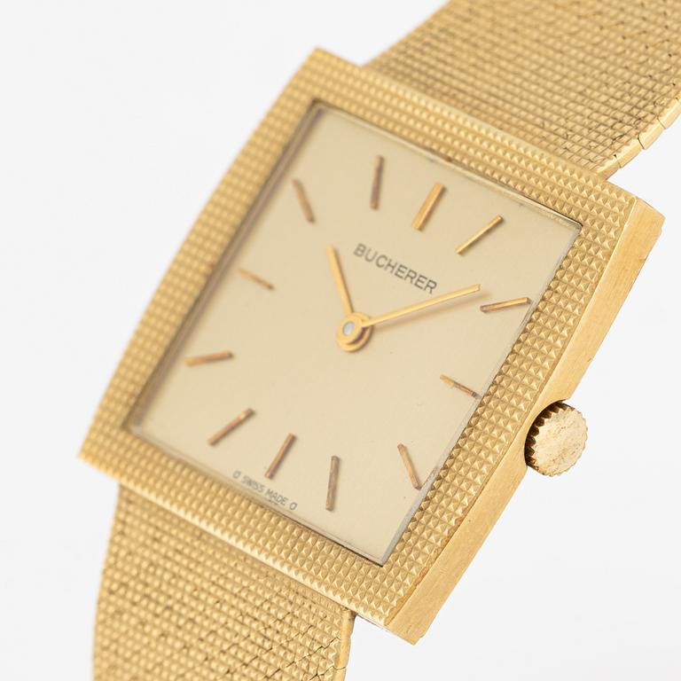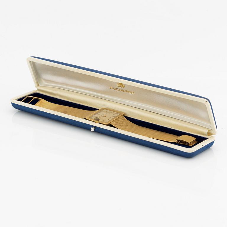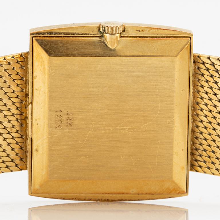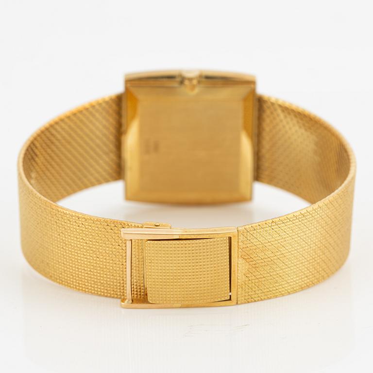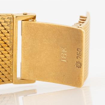 18K gold, manual, plastic crystal, integrated bracelet, total weight approx. 80 grams, box, circa 1975.