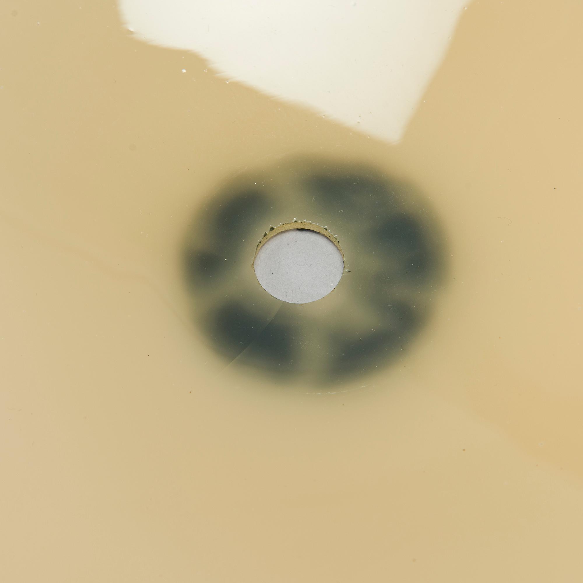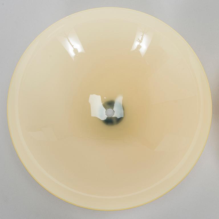 Kultaopaalilasia ja messinkirunko kolmella valopisteellä. Halkaisija 35 cm. Korkeus noin 14 cm.