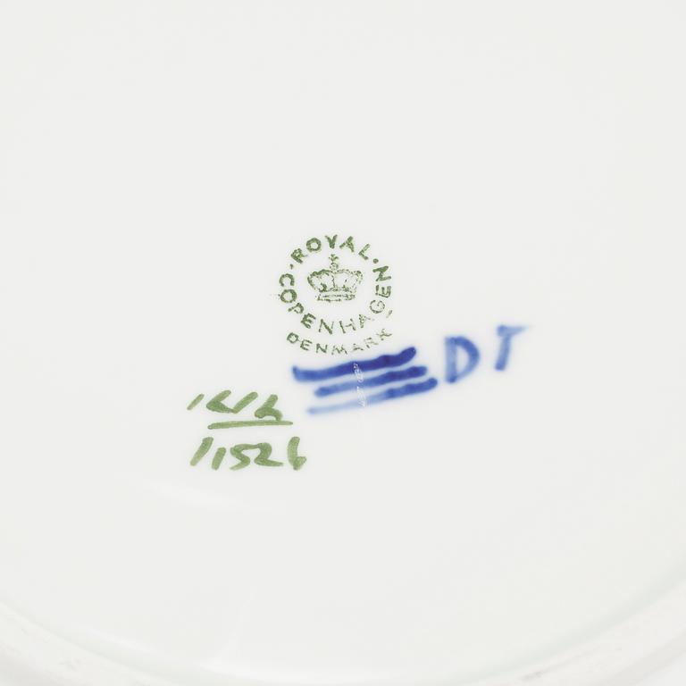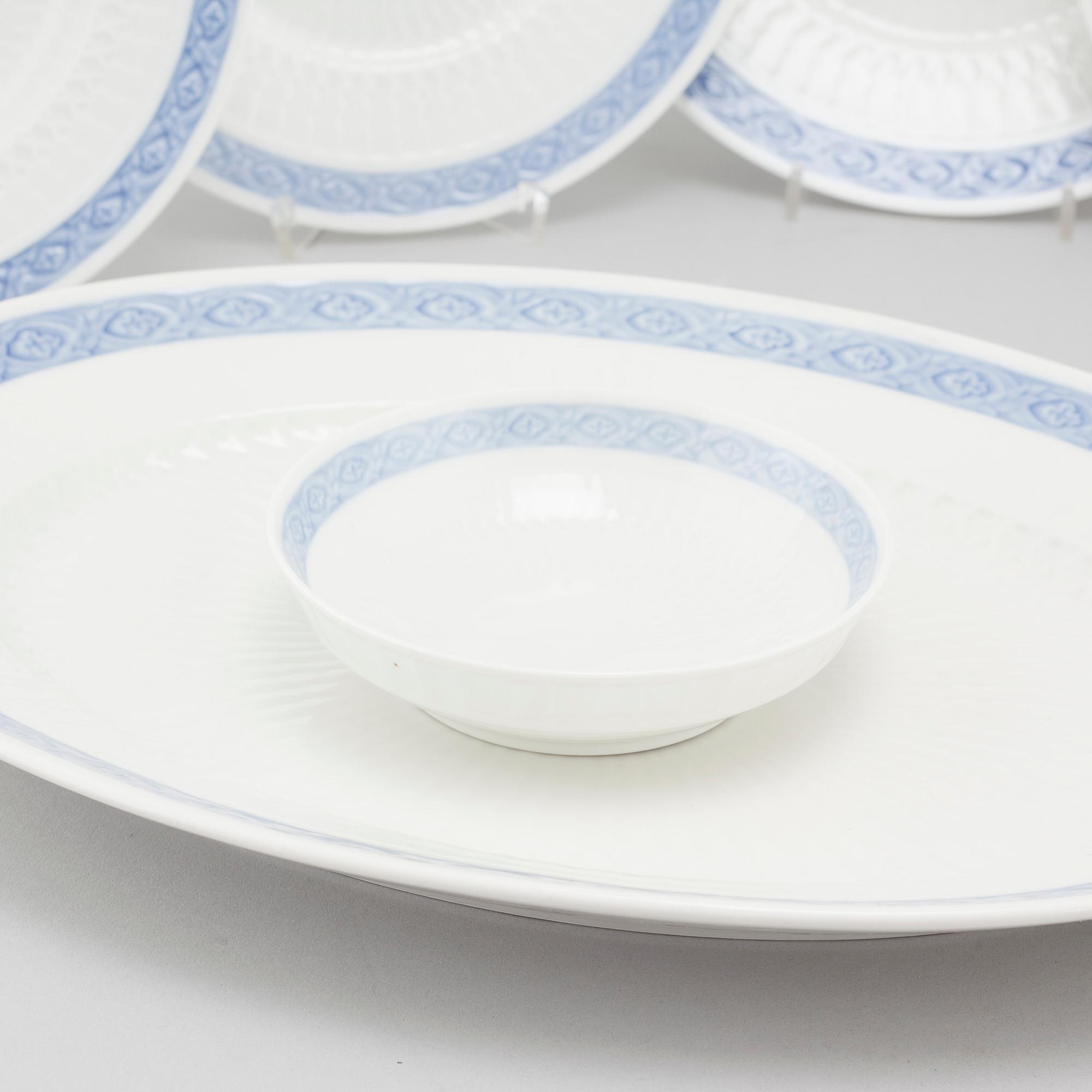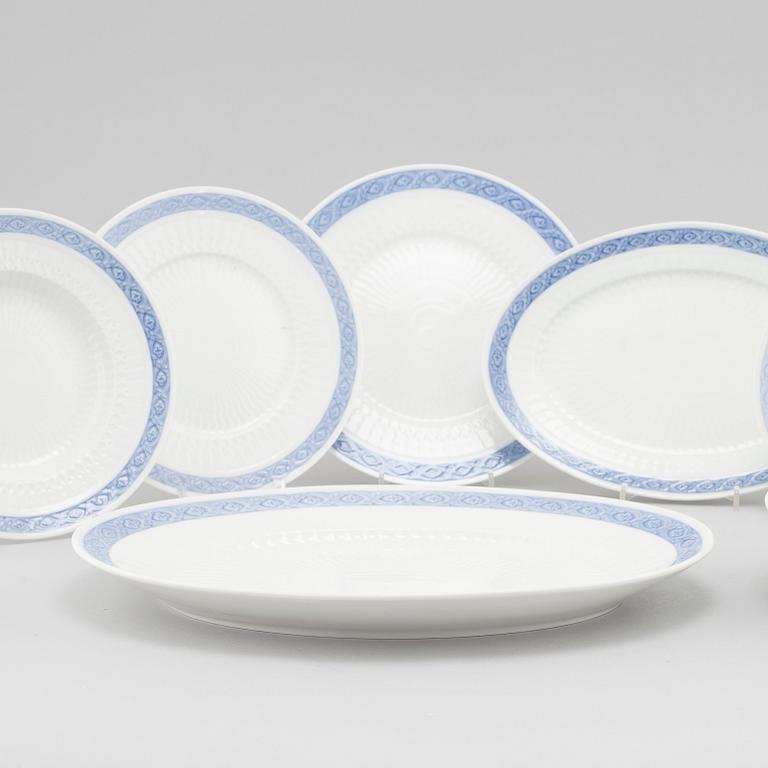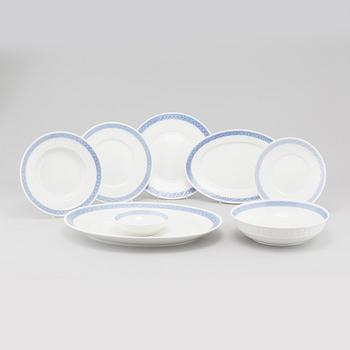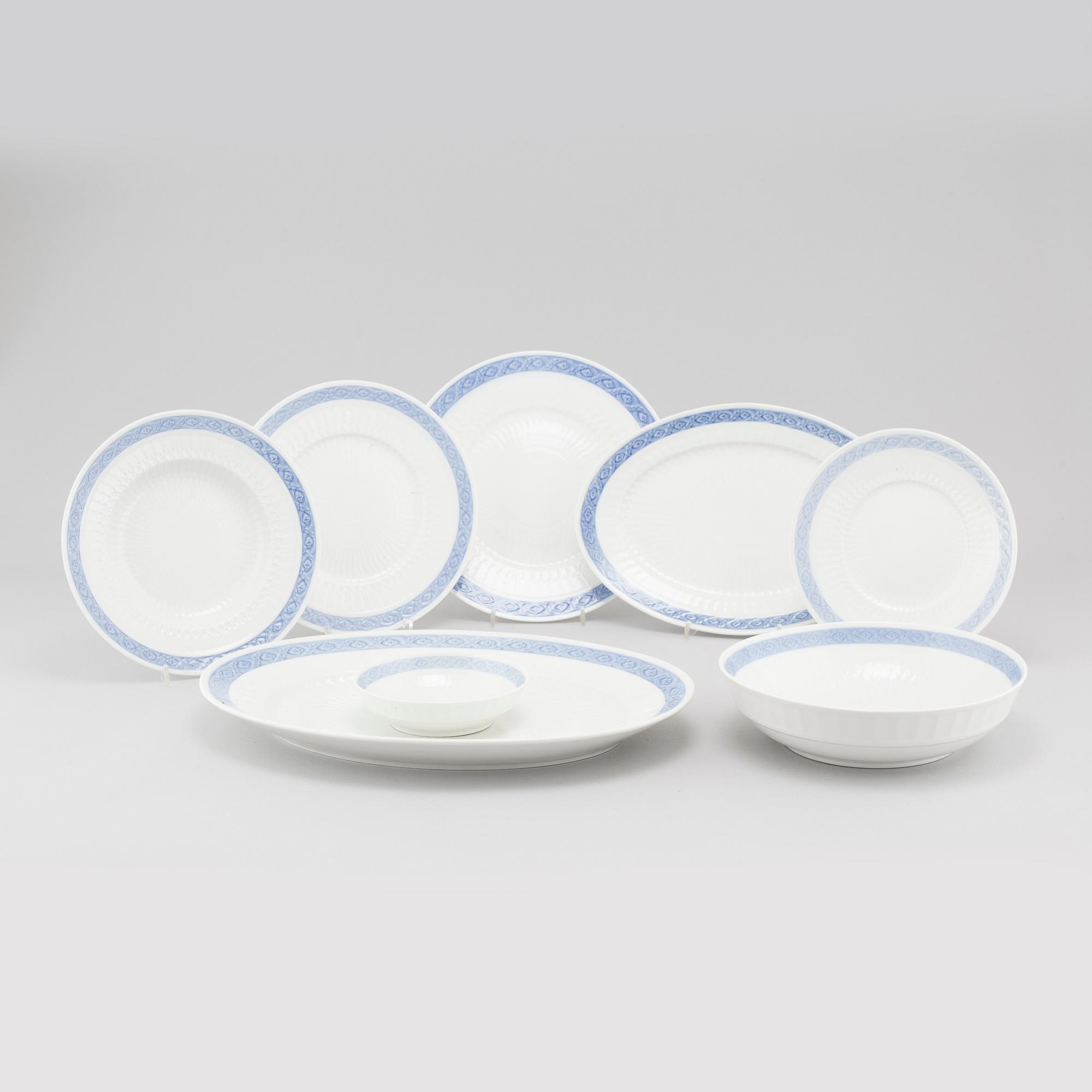 Ten dinner plates, ten soup plates, ten first course plates, ten small plates, two serving dishes, two serving bowls.