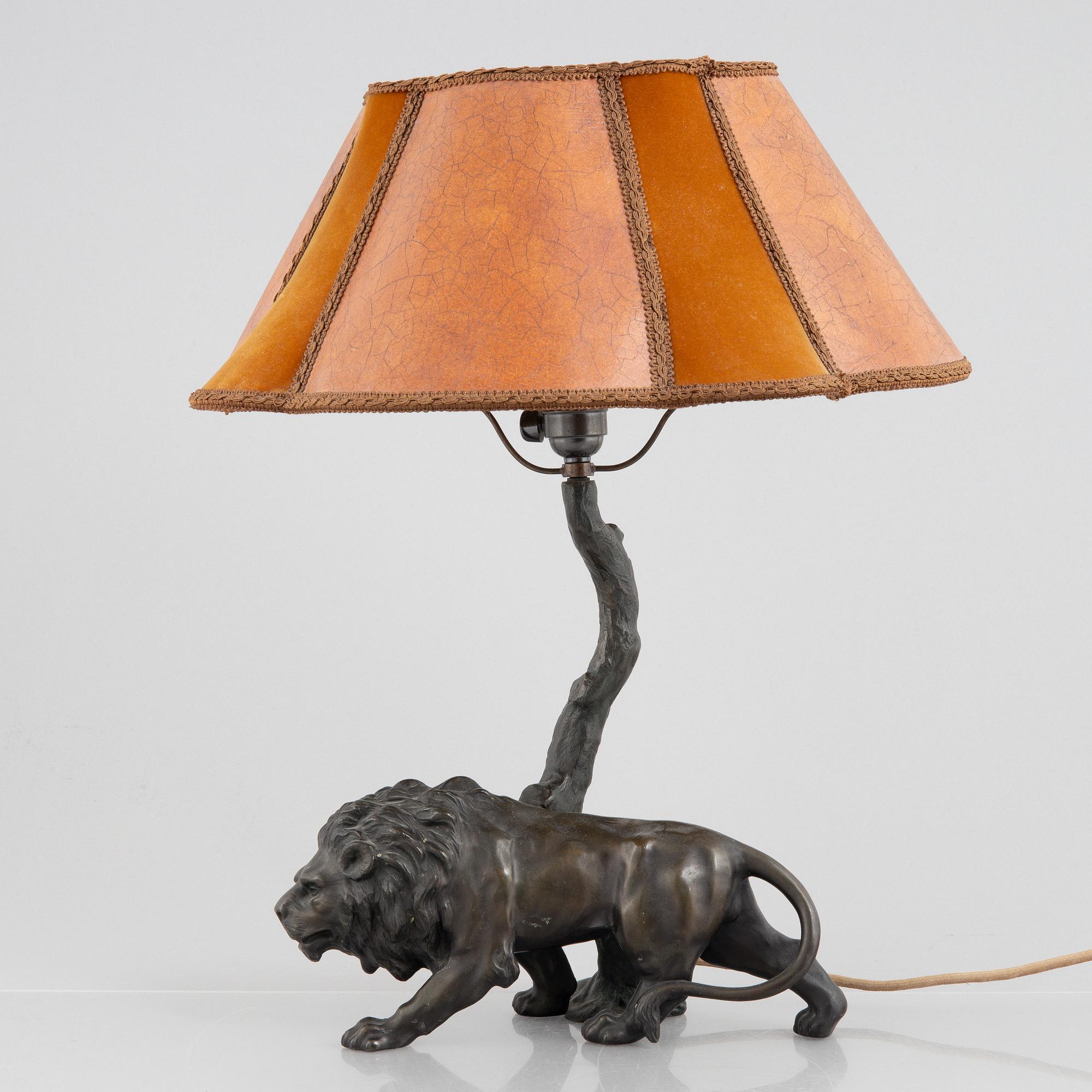 Of patinated bronze. In the form of a lion against a tree trunk. Height 54 cm.