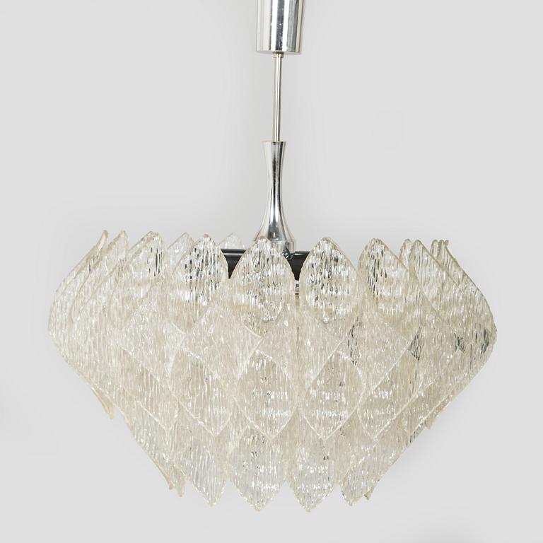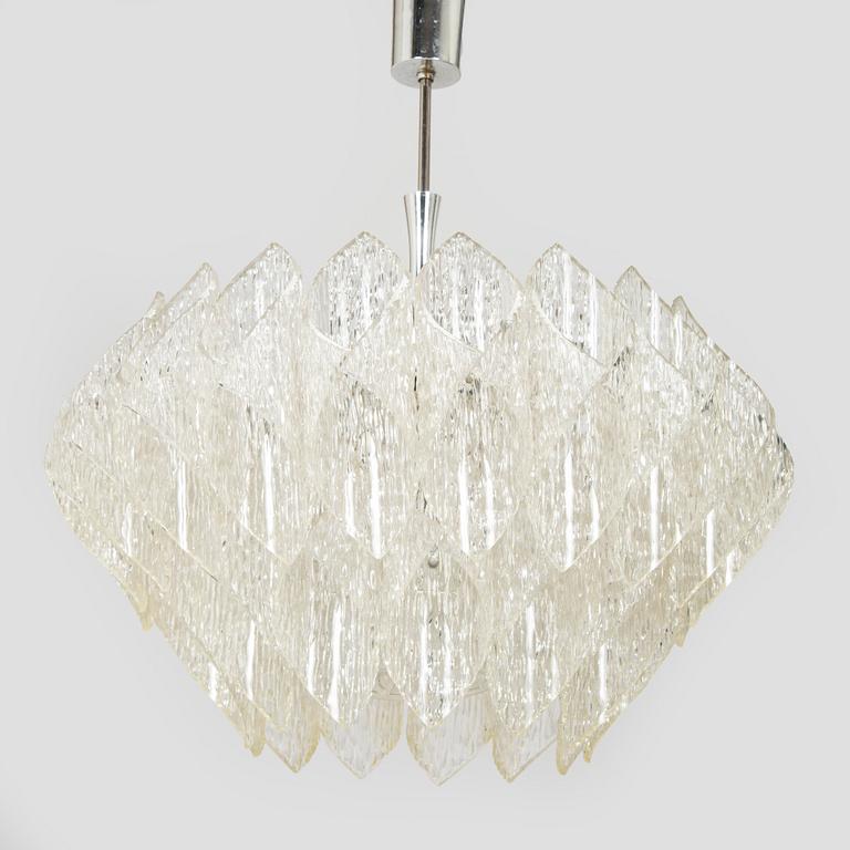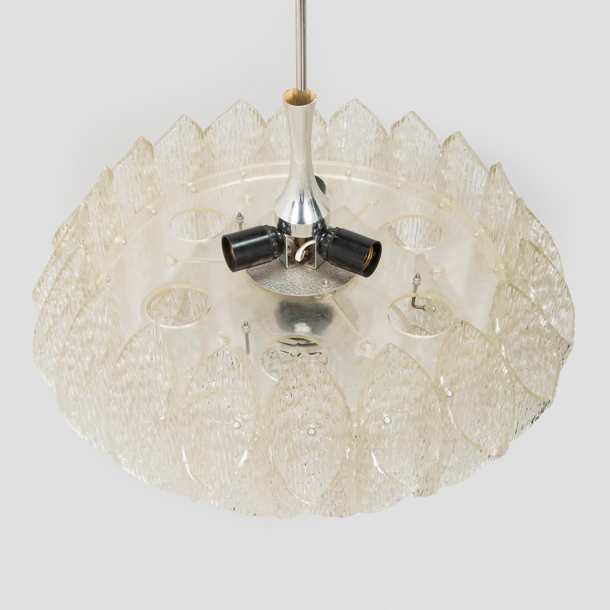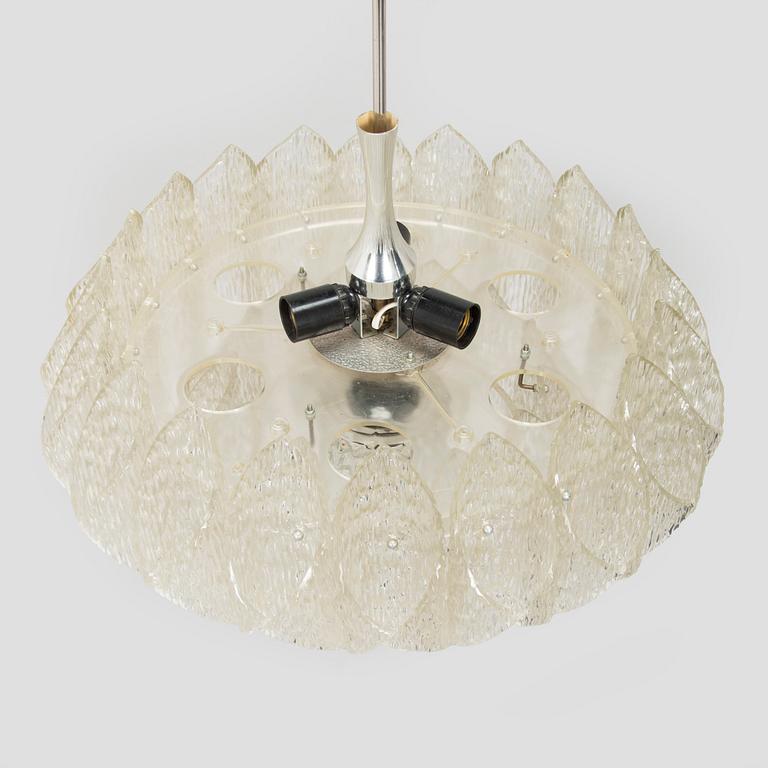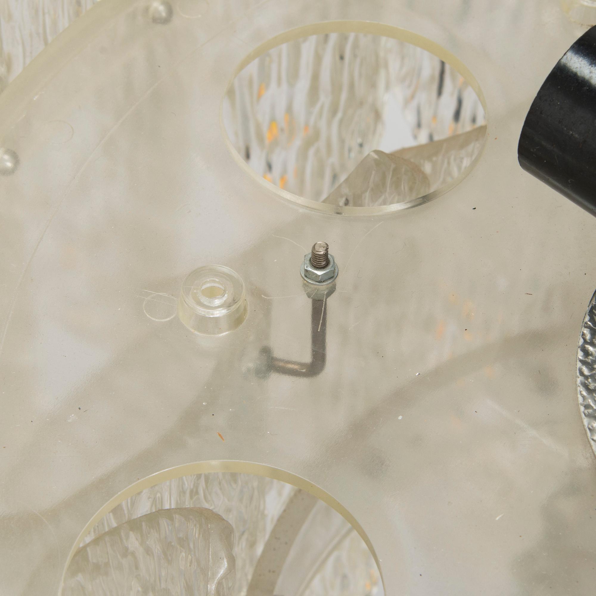 Runko metallia ja muovia, lasi- ja akryylivarjostimilla. Halkaisija 60 cm. Kokonaiskorkeus noin 67 cm.