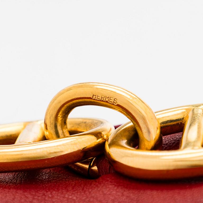 Punaista lampaannahkaa kullanvärisillä metallikoristeilla. Silkkivuori. Merkitty "HERMÈS PARIS Made in France"