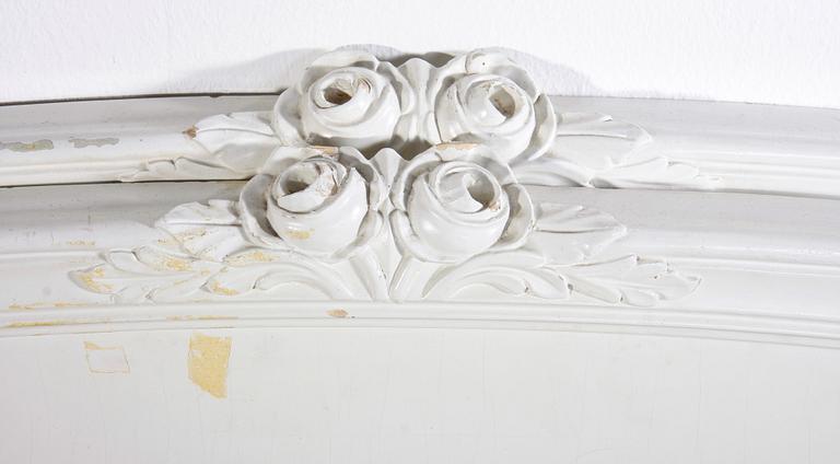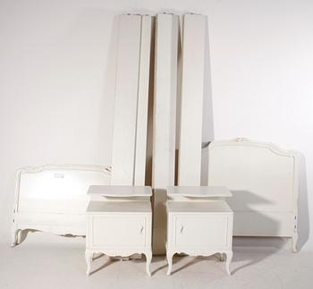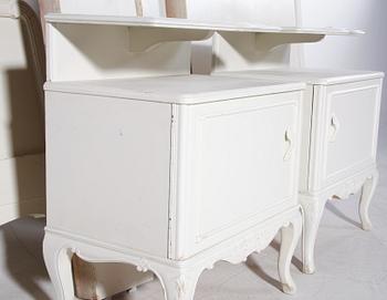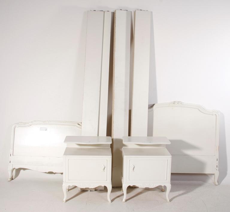 Rokokostil. Dubbelsäng, tvådelad. Vitmålade med roskrön. L 200, b 200, h 95. Bord med hylla och skåp, l 49, b 32, h 61.