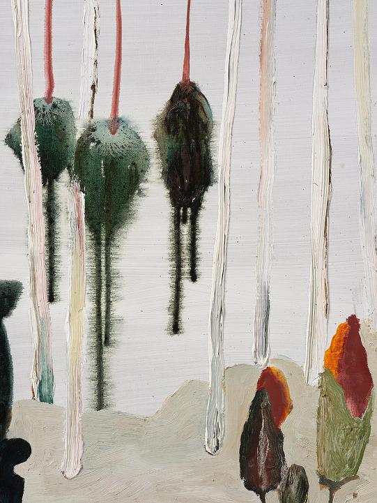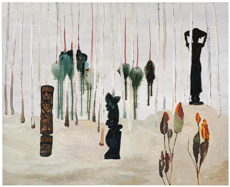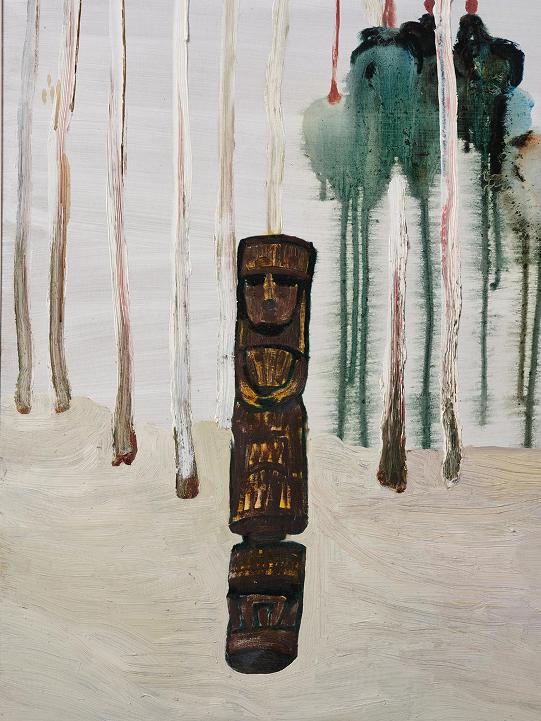 The pale tree trunks—so often present in her work from this period—stand upright. Tucked in among them are totem poles and sculptures bearing traces of now-extinct cultures from Africa or South America. The contrast with the Scandinavian forest landscape and the seemingly frozen ground heightens their distinctive expression. Fashioned from tree species that have grown on the other side of the world, they convey a message about the cycles of life and the rise and fall of human cultures. Nature is the only enduring force: the trees continue to grow, while the traces of human presence are gradually erased, eventually becoming entirely enveloped by living organisms. In the lower right-hand corner of the painting, yellow flowers emerge, symbolising rebirth and hope.