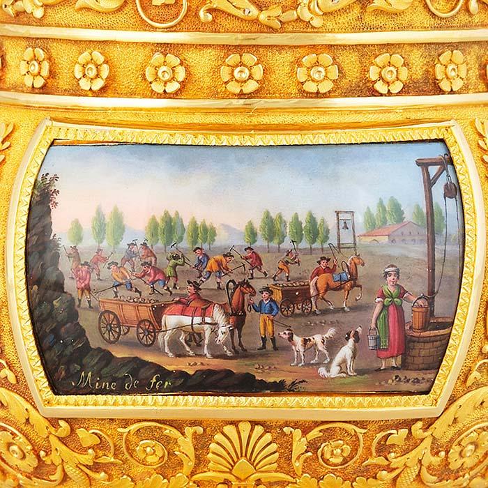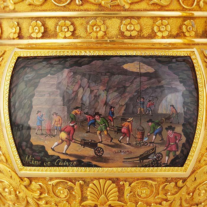 Details of the enamel miniatures illustrating mining of gold, copper and iron.