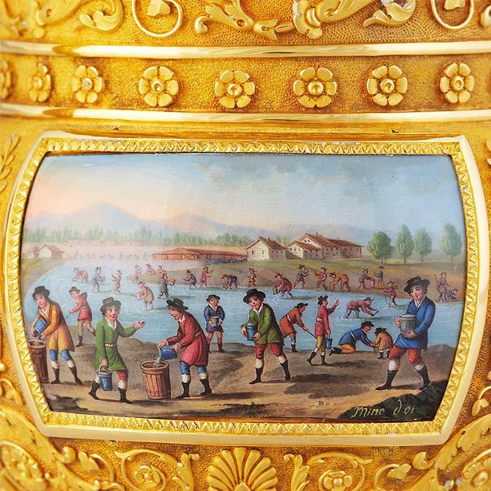 Made of Siberian gold from the family’s own mines by the Parisien goldsmith Morel, the Demidoff cup combines Russian excess and extravagance with the highest class of French Empire style; fitting for one of the wealthiest families of its day who were great admirers of Napoleon. The decoration with its painted miniatures representing gold, copper and iron mining is not only a reference to the background of the cup itself but also a clear reminder of the source of the family’s wealth in the mining and metal industry. The Demidoff Gold Cup is thus not only an exquisite and exclusive work of art but also an embodiment of the House of Demidoff. It is truly an illustration of their historical significance.