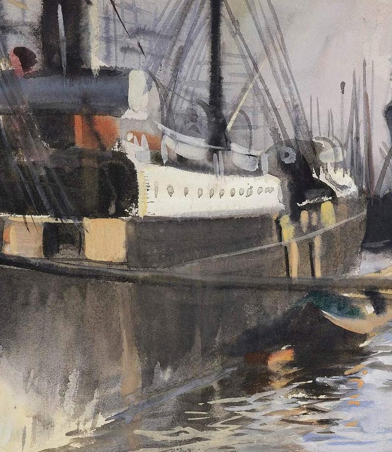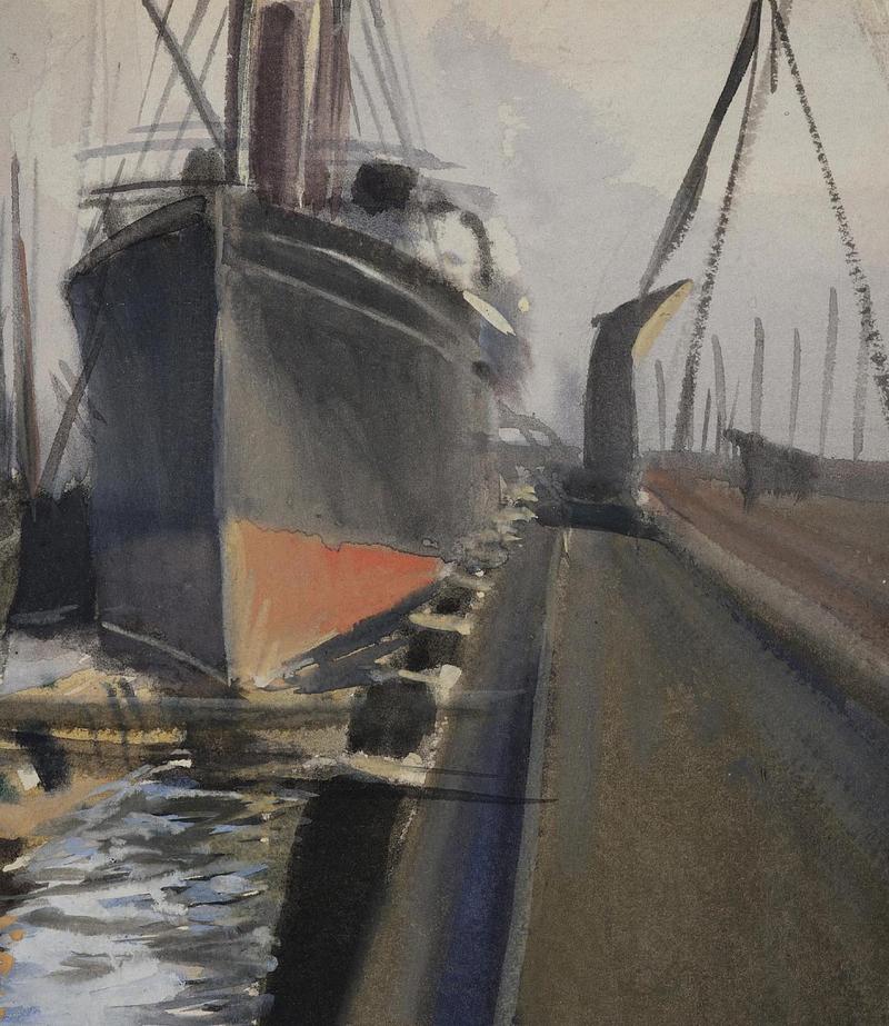 He writes: "In the loosely composed sketches, his visual impressions of the harbour are reduced to summary suggestions of dark hulls reflected in the water or of a quay that, in an effective diagonal, runs into the picture. [...] But the impressionist Zorn has primarily concentrated his attention on momentary experiences of natural phenomena, the shifts of light, the swirling movements of water, the steam, and the air in Hamburg's murky harbour basin with its caissons and distant-going vessels."