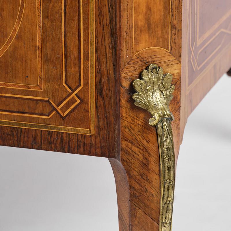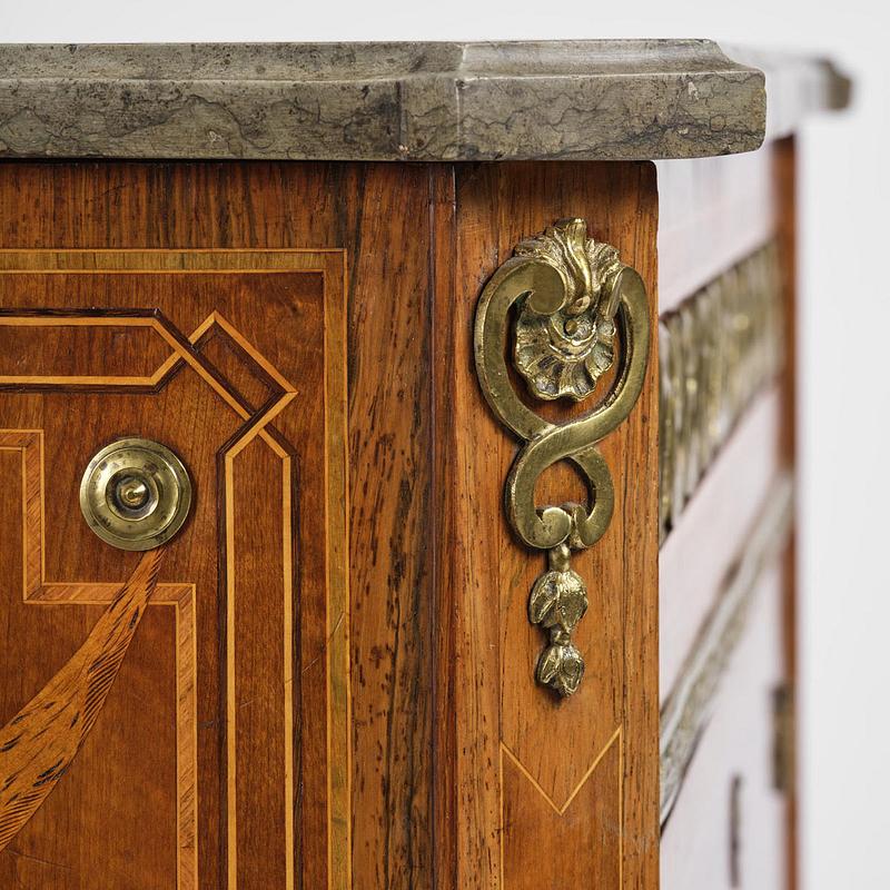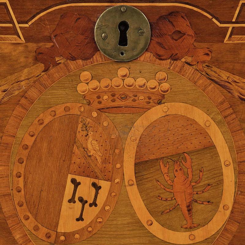 Auktionens byrå är mycket välbevarad, där den ursprungliga färgrikedomen kan skönjas i alliansvapnets färgtoner och lagergirlandens röda band. Även gravyren med inlagda vaxer är välbevarad, vilket ger nerv åt bladverk och ljusdagrar. Konsten att förhöja den tredimensionella effekten med hjälp av gravyr på större fanerbitar kom att bli särskilt utvecklad i Sverige av de gustavianska mästarna, till skillnad från de franska och tyska ebenisterna vilka byggde upp motiven genom att foga samman små fanerbitar.