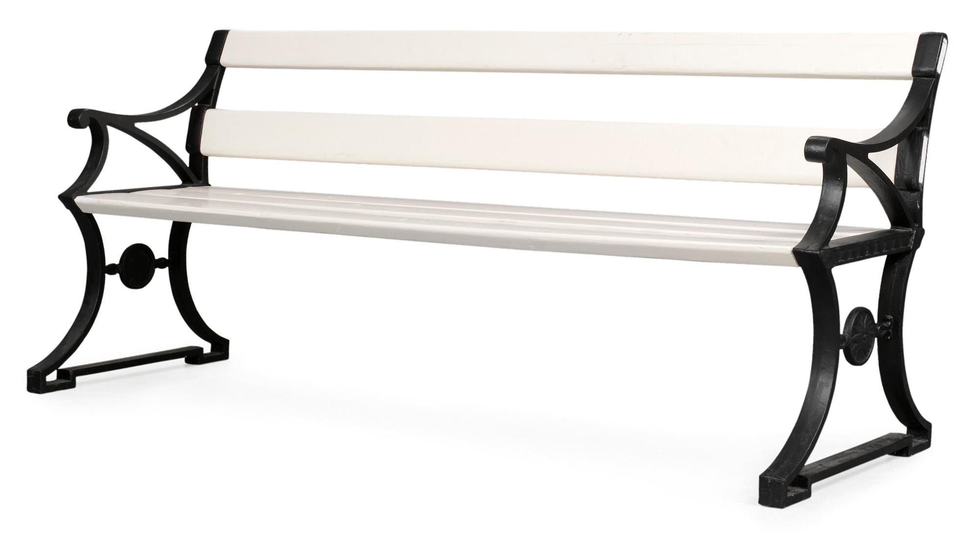 Svartmålat gjutjärn, vitmålade träplankor. Längd 198 cm, höjd 84 cm.