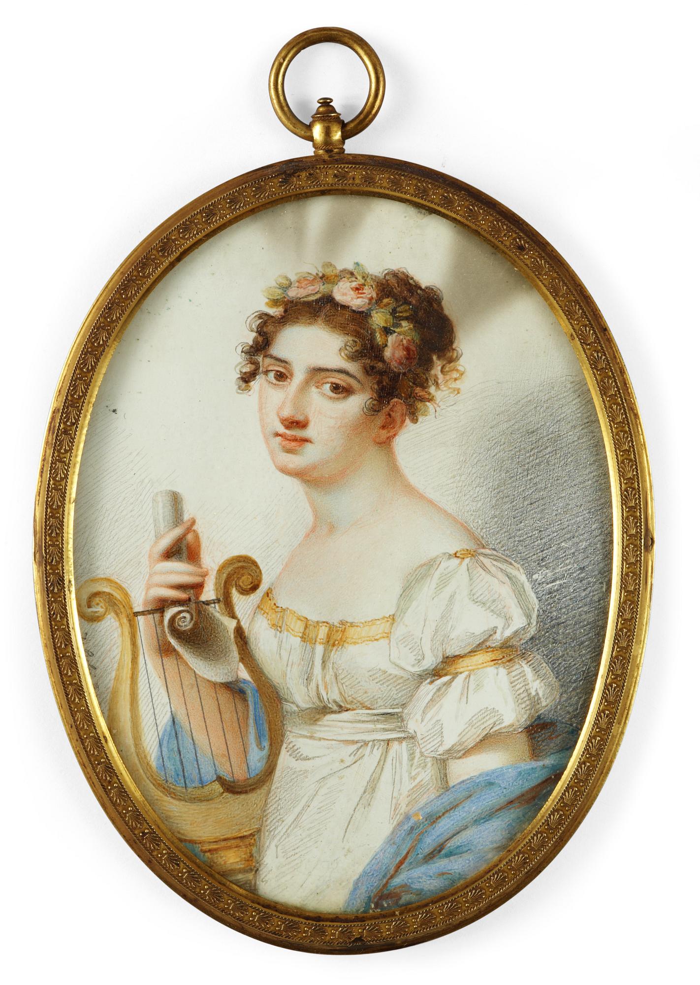 Miniatyr. Signerad D: Bossi. Akvarell och blyerts på papper? 12 x 9 cm. Samtida innefattning i mässing.