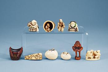 1503. NETSUKES, 10 stycken, trä, elfenben och ben. Japan, Meiji.