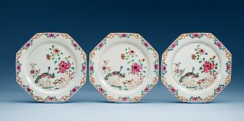 1583. TALLRIKAR, tre stycken, kompaniporslin. Qing dynastin, Qianlong (1736-95).