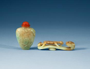1567. SNUSFLASKA med LOCK, samt BÄLTESSPÄNNE, nefrit. Qing dynastin.