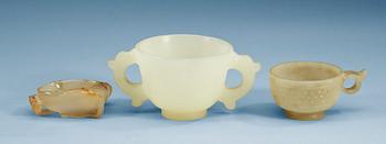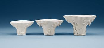 1511. VINOFFERSKÅLAR, tre stycken, blanc de chine. Qing dynastin.