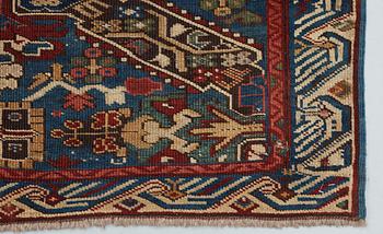 Mellanblå botten med stora polykroma s.k. fläktmönster, blommor och S. Huvudbården med löpandehund-dekor.