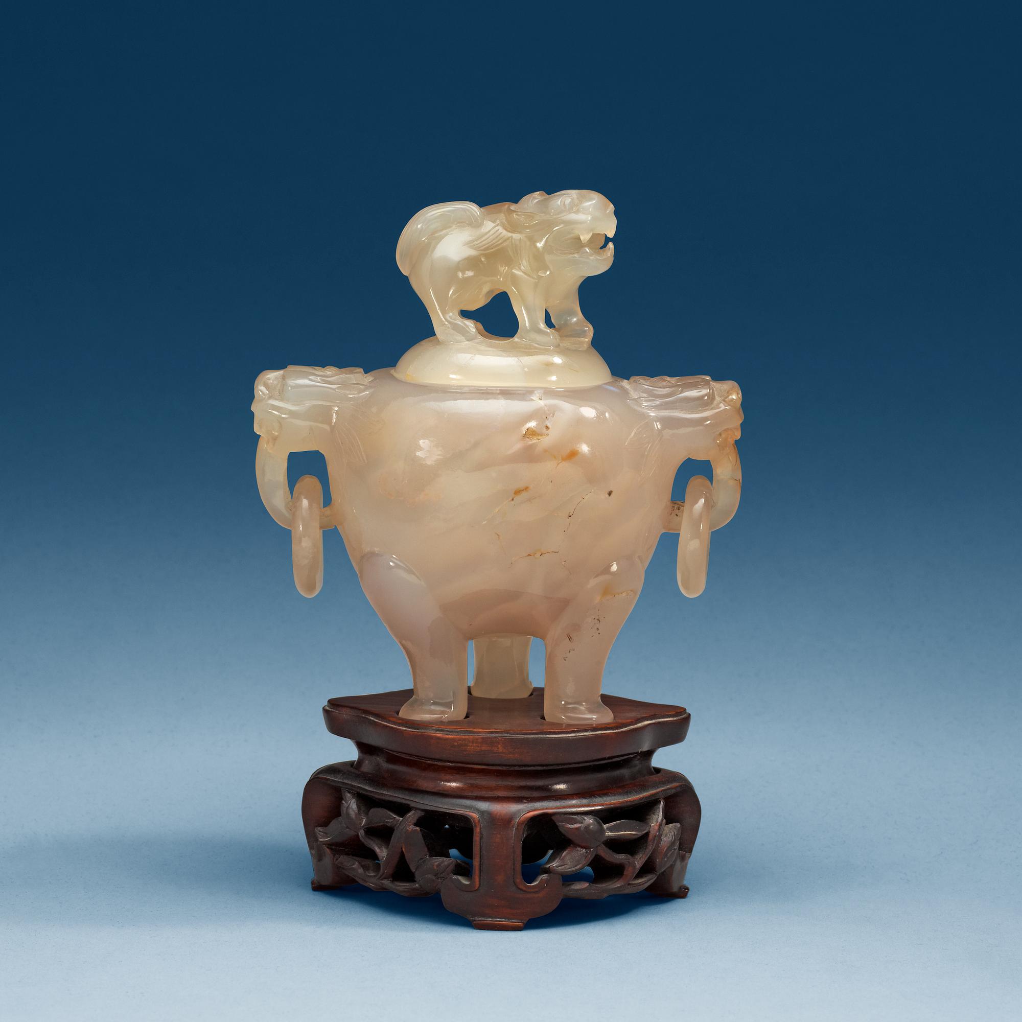 Tripod med ringmaskaroner och krönande fohund på locket. Höjd 12,5 cm.