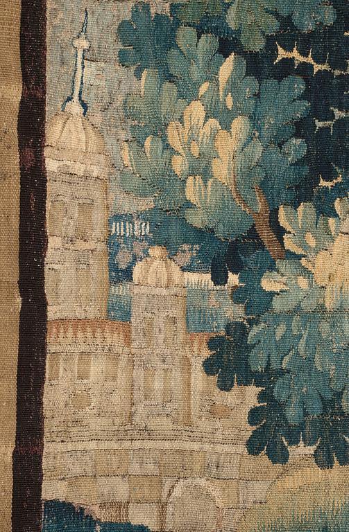 Polykromt landskap med fåglar, träd, blommor och i fonden slottsbyggnader. Mörkbrunmelerad bård med frukter, blommor och urnor. Ull och silke.