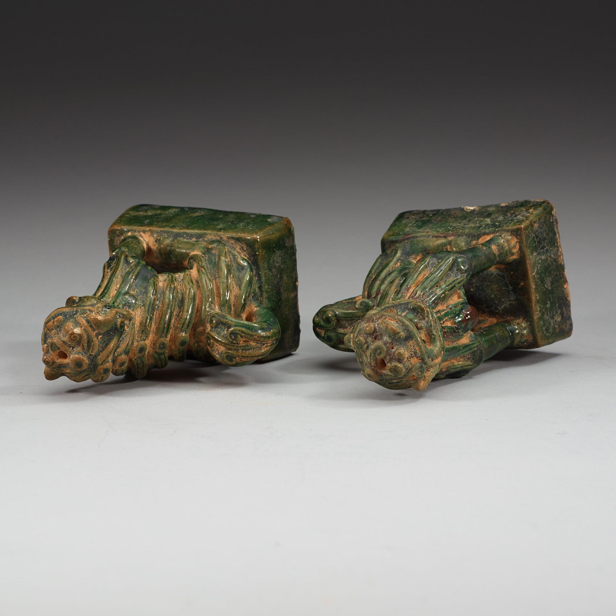 Sittande grönglaserade fohundar. Höjd 15 cm.