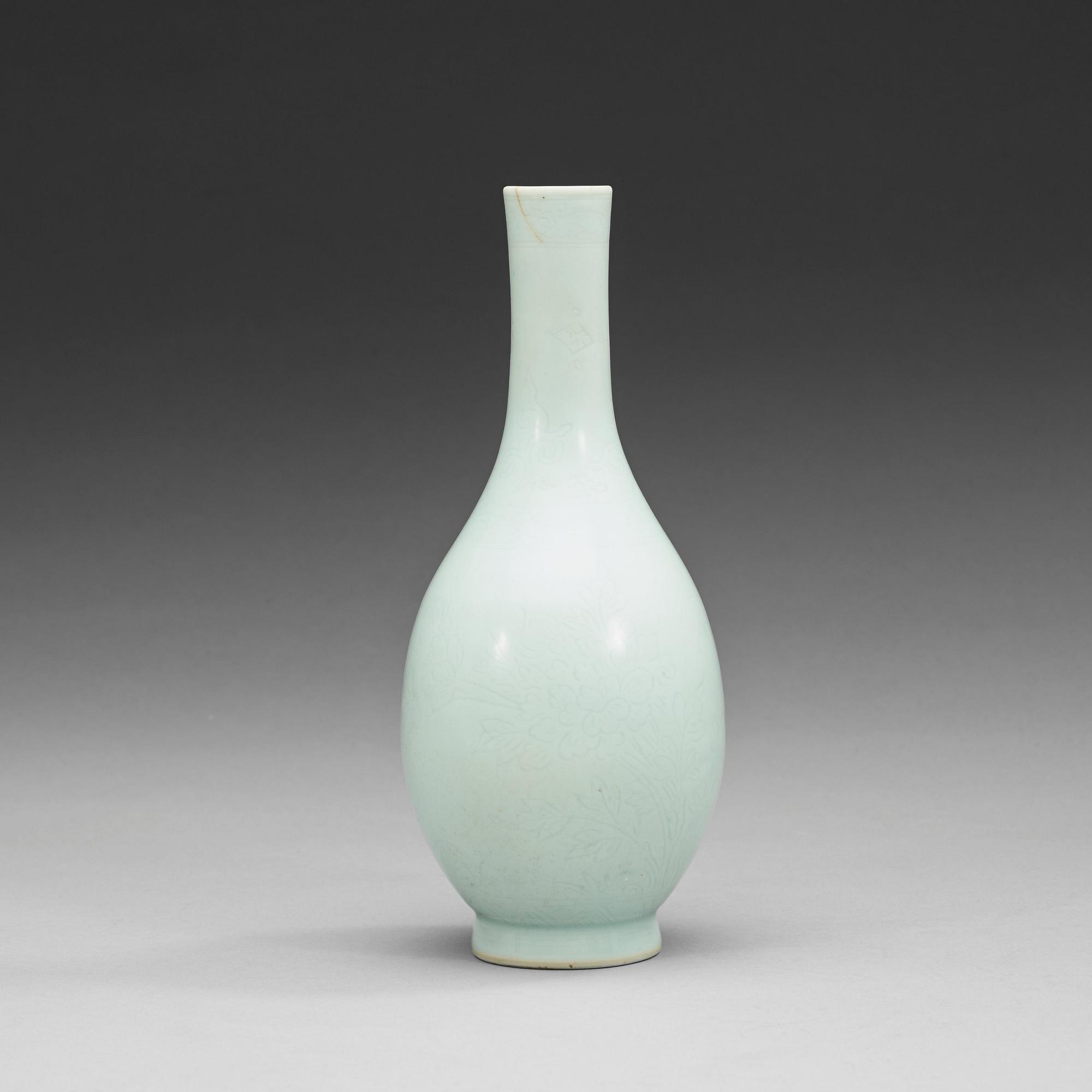 Vitglaserad med ristad dekor av blommor och fjäril. Höjd 20 cm.