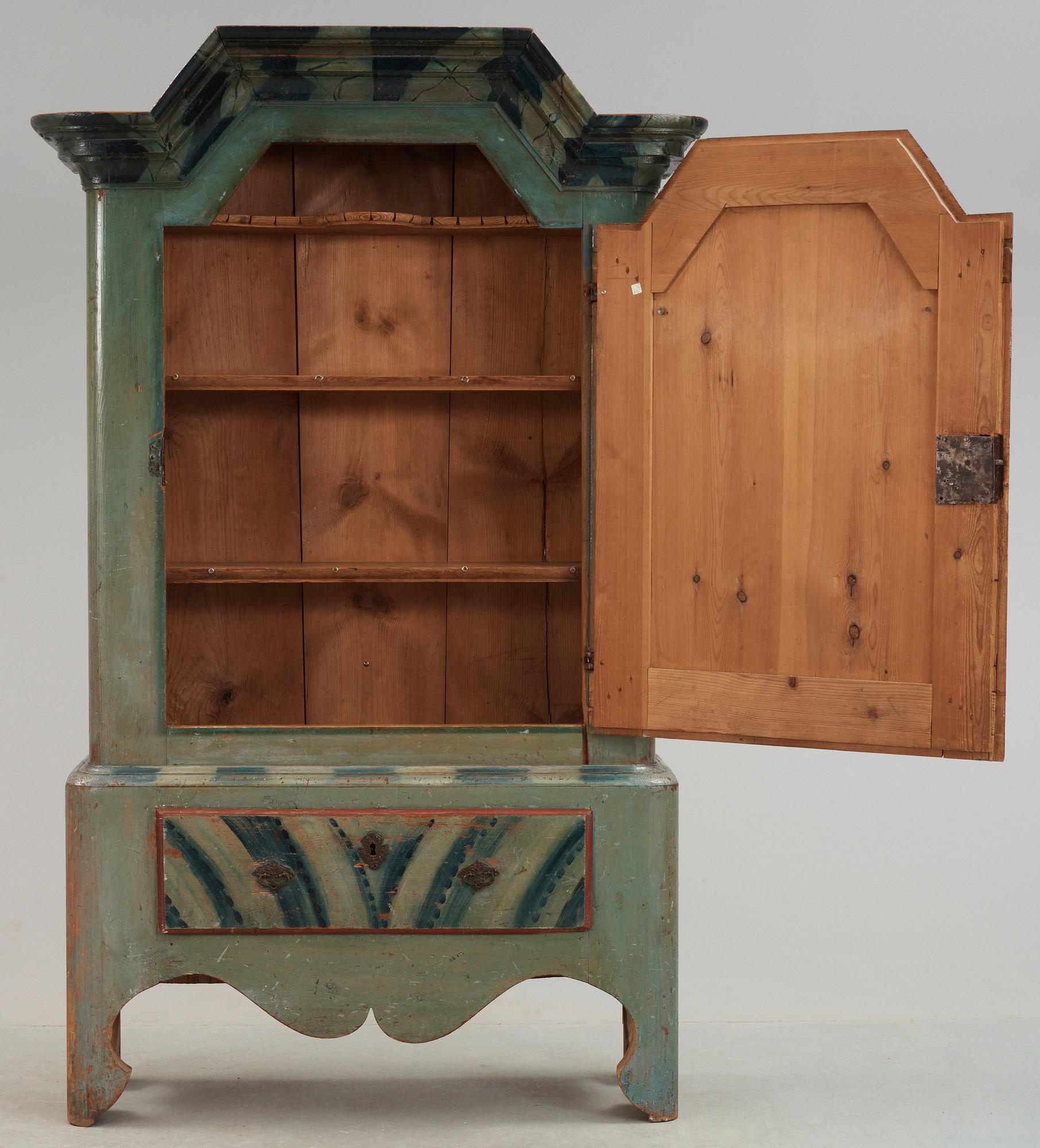 Blåmålat. Dörren med dekor av blomsterkvist. Brutet marmorerat krön. Profilerad nederdel med låda. Märkt BLD. Längd 111, bredd 38, höjd 197 cm. Nyckel medföljer.