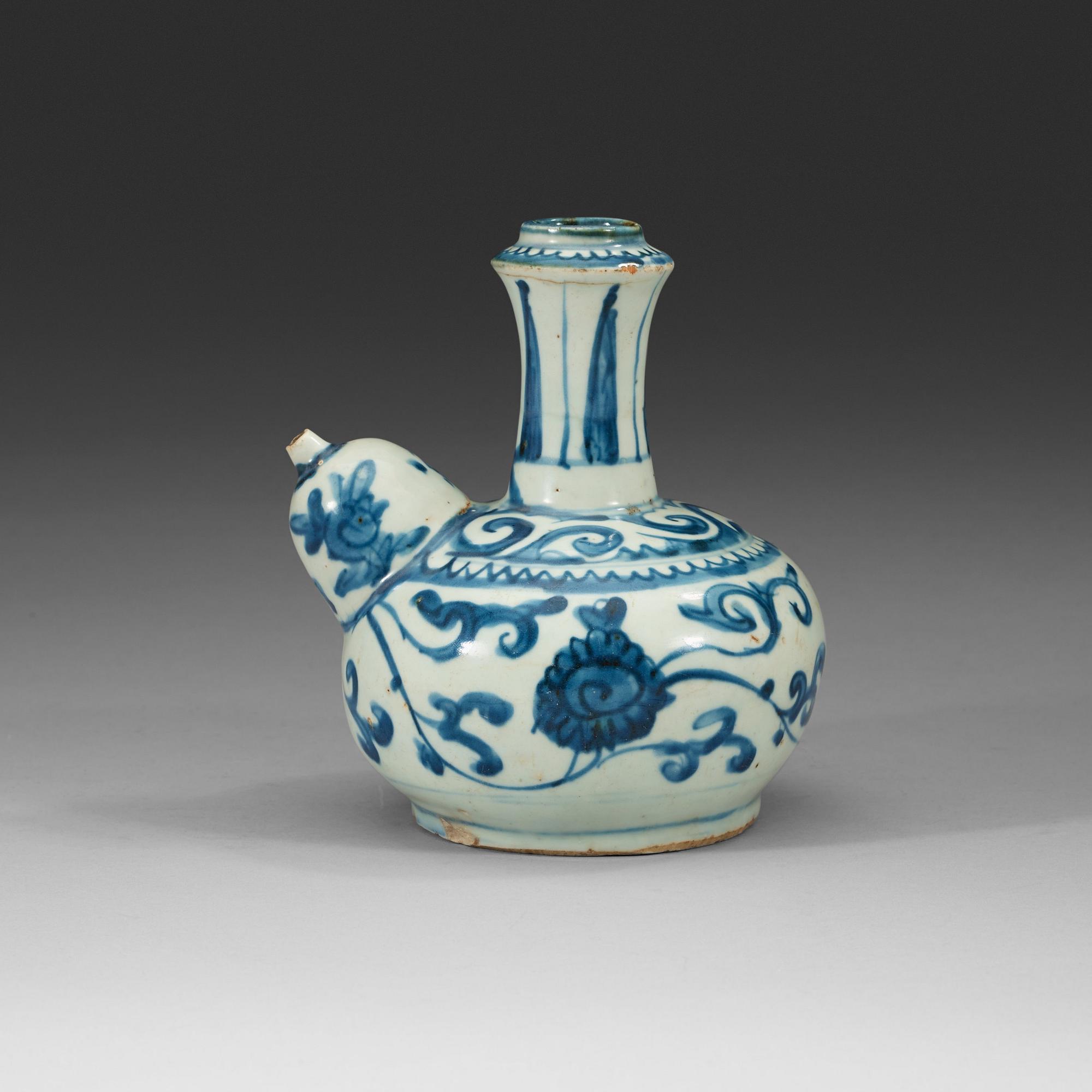 Dekor i underglasyrblått av växter. Höjd 16,3 cm.