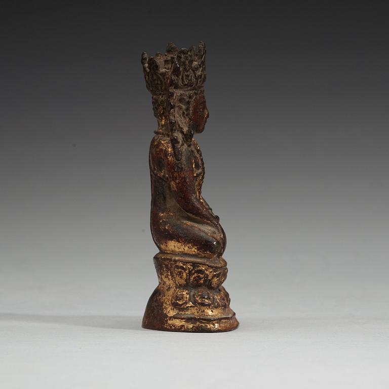 Sittande i dhyanasana på dubbel lotustron, hans högra hand i bhumisparsa mudra. Höjd 11,5 cm.