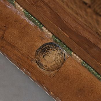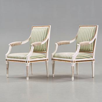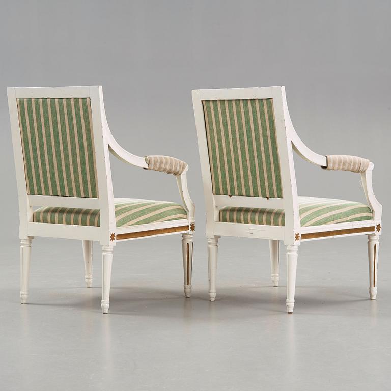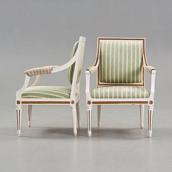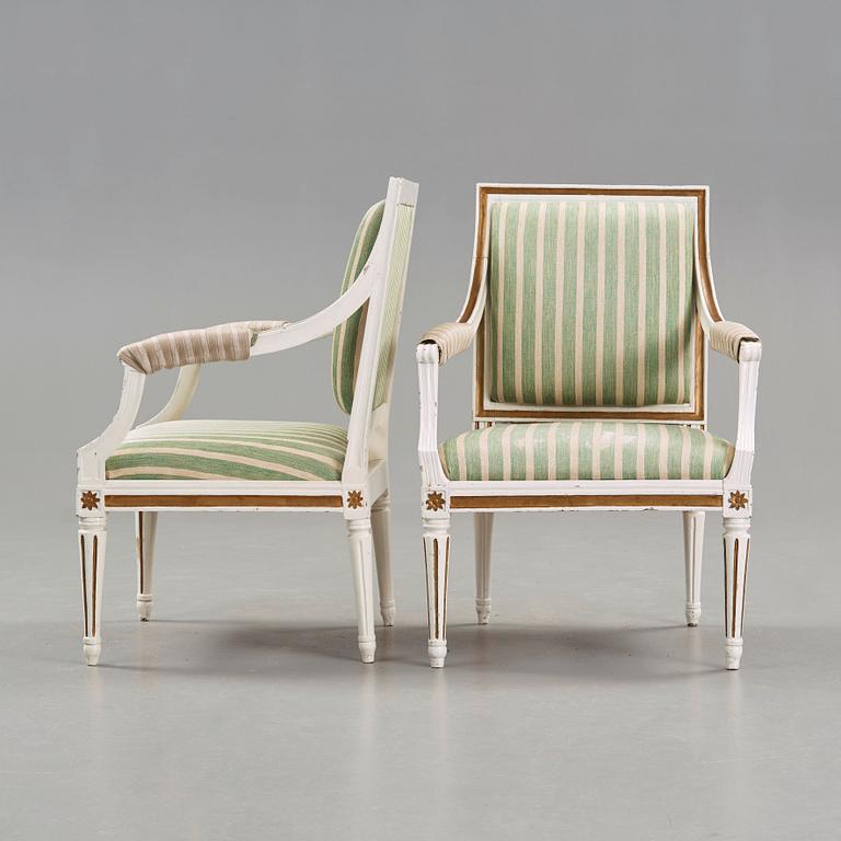 Vitmålade och bronserade. Lös stoppad rygg och sits. Båda med Stockholm stolmakareämbetes sigill.