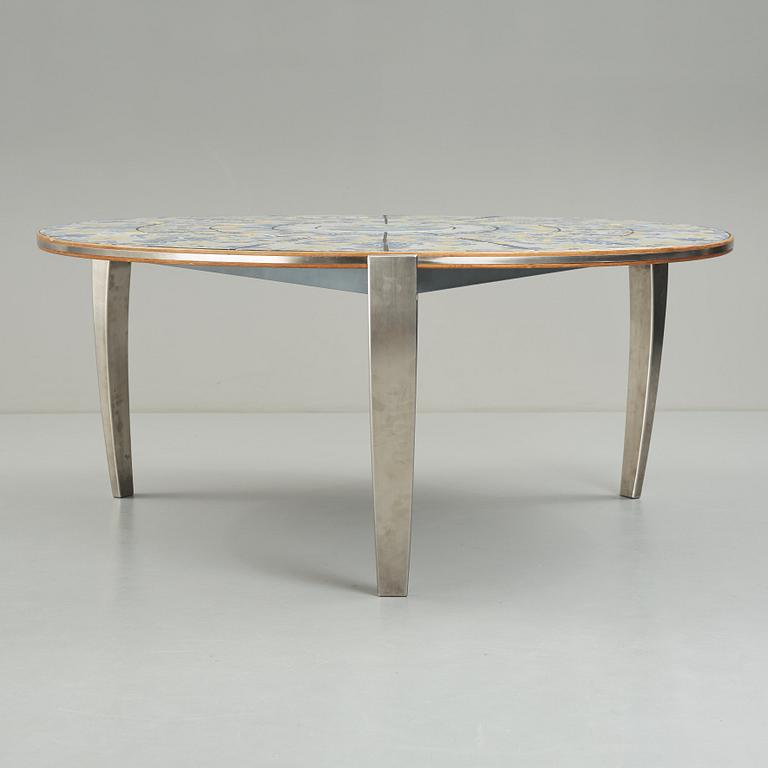 Skivan med kakeldekor signerad av Björn Wiinblad 1974, kantlist i stål och furu, benställning i borstat stål, höjd 73 cm, diameter 167 cm.