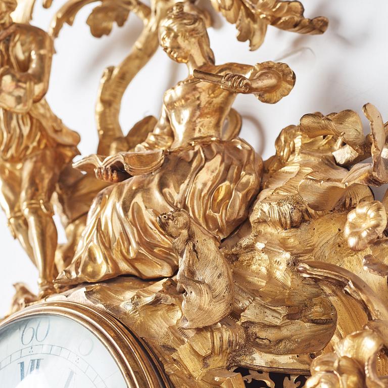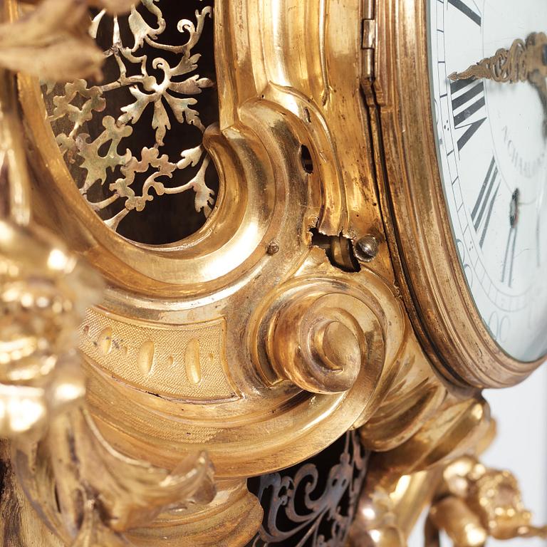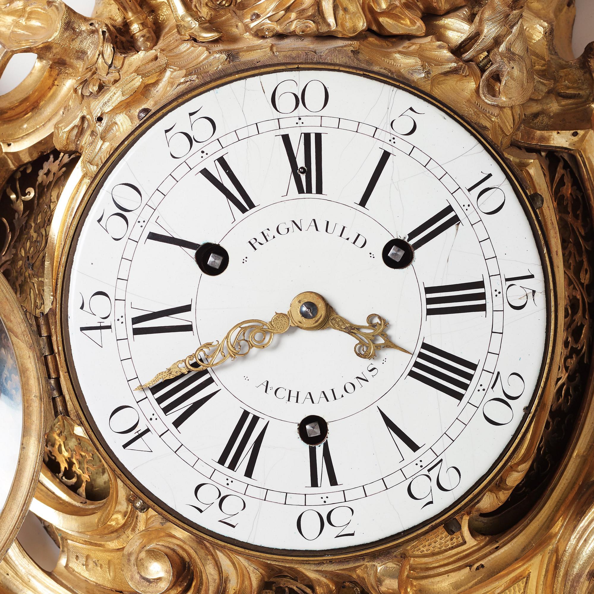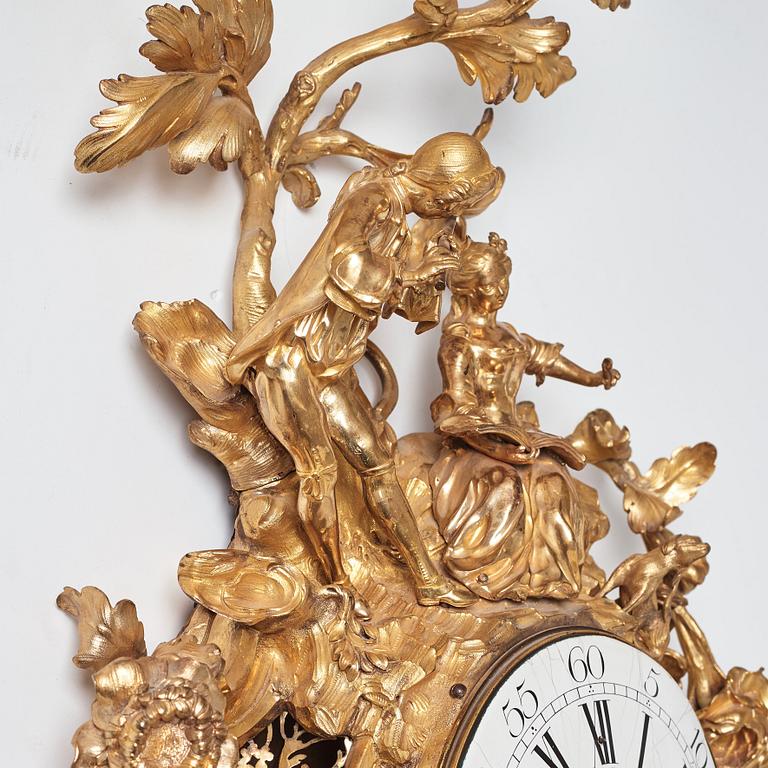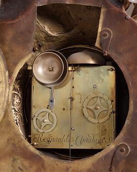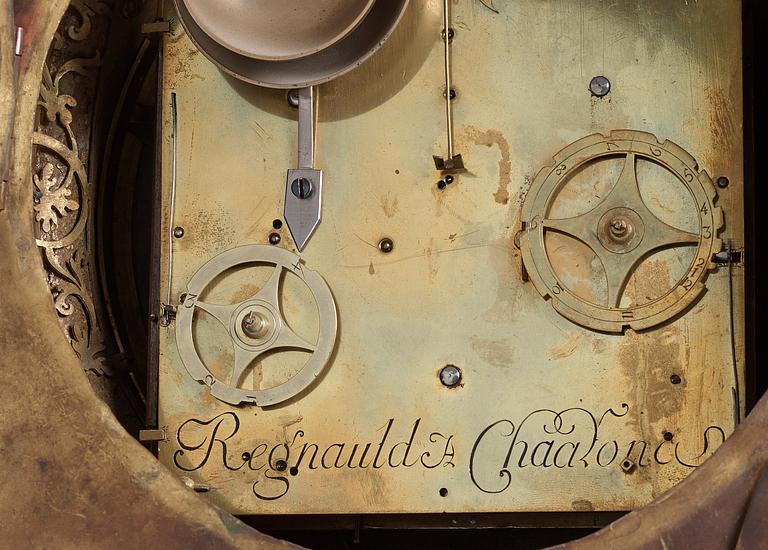 Förgylld brons. Krön med musicerande par och en hund. Rikt lövverk med blommor. Damens nothäfte med graverad text "Rosignol dans le doux" (troligen musik komponerad av Jean-Baptiste Drouart de Bousset, Frankrike 1662-1725). Vitemaljerad urtavla. Urtavla och urverk märkt "Regnauld A Chaalons". Med hel- och kvartslag på tre klangskålar. Höjd 120, bredd 55 cm. Pendel medföljer.